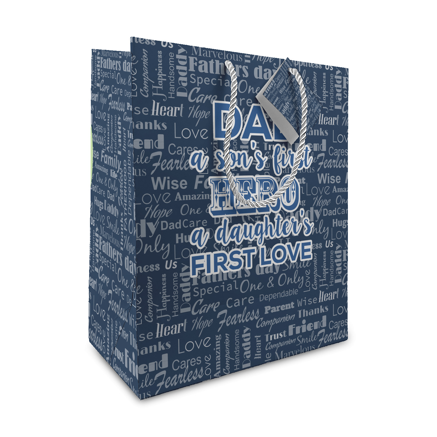 The background of this design is a fun word cloud that says different words to describe a father like "friend," "thanks," "father's day," "happiness," and more. The design is filled with a few different shades of blue and a little accent of white. The main graphic is a quote that says "Dad, a son's first hero, a daughter's first love." What a sweet design for Father's Day!