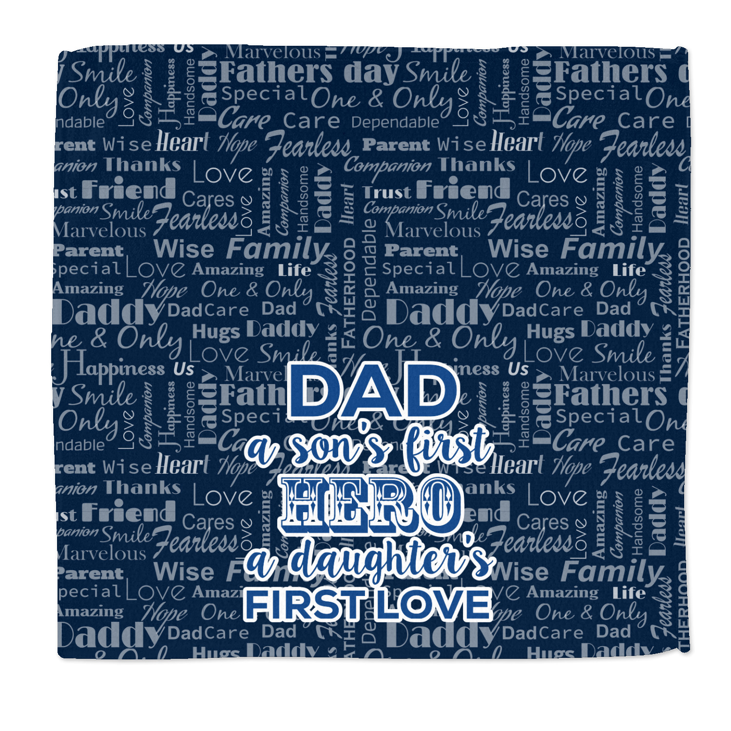The background of this design is a fun word cloud that says different words to describe a father like "friend," "thanks," "father's day," "happiness," and more. The design is filled with a few different shades of blue and a little accent of white. The main graphic is a quote that says "Dad, a son's first hero, a daughter's first love." What a sweet design for Father's Day!