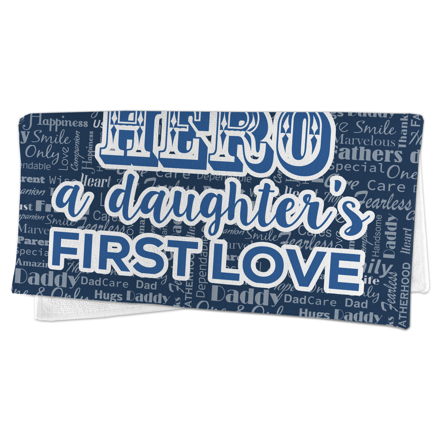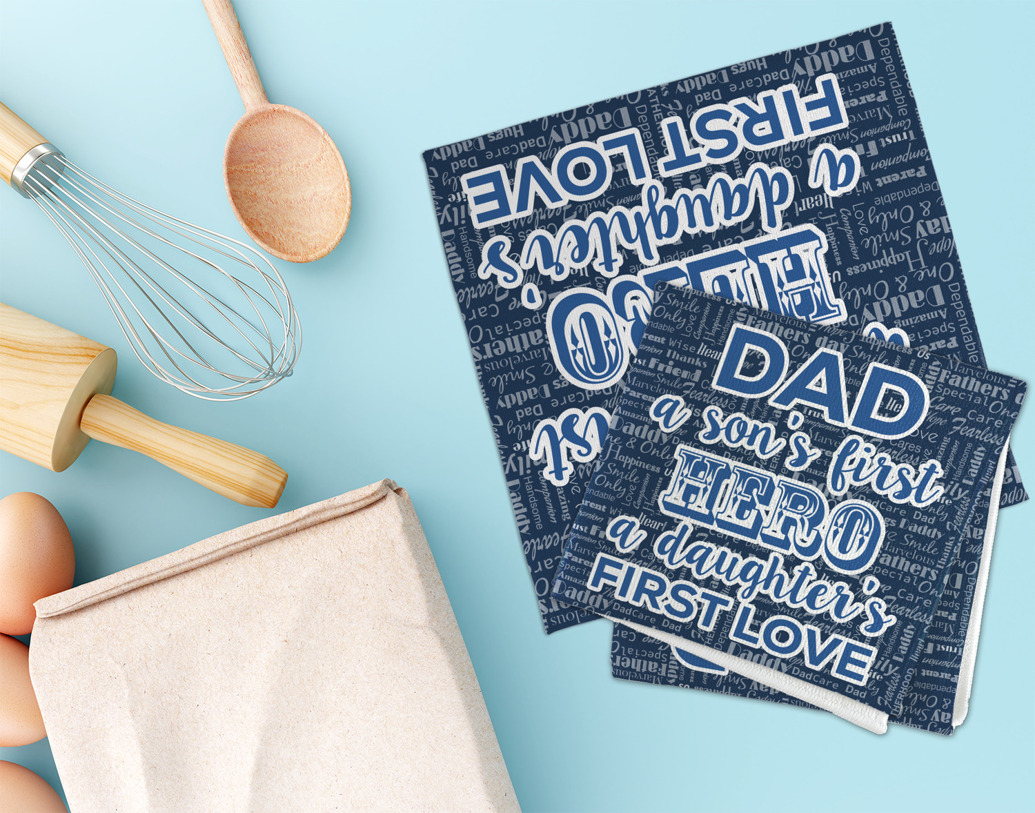 The background of this design is a fun word cloud that says different words to describe a father like "friend," "thanks," "father's day," "happiness," and more. The design is filled with a few different shades of blue and a little accent of white. The main graphic is a quote that says "Dad, a son's first hero, a daughter's first love." What a sweet design for Father's Day!