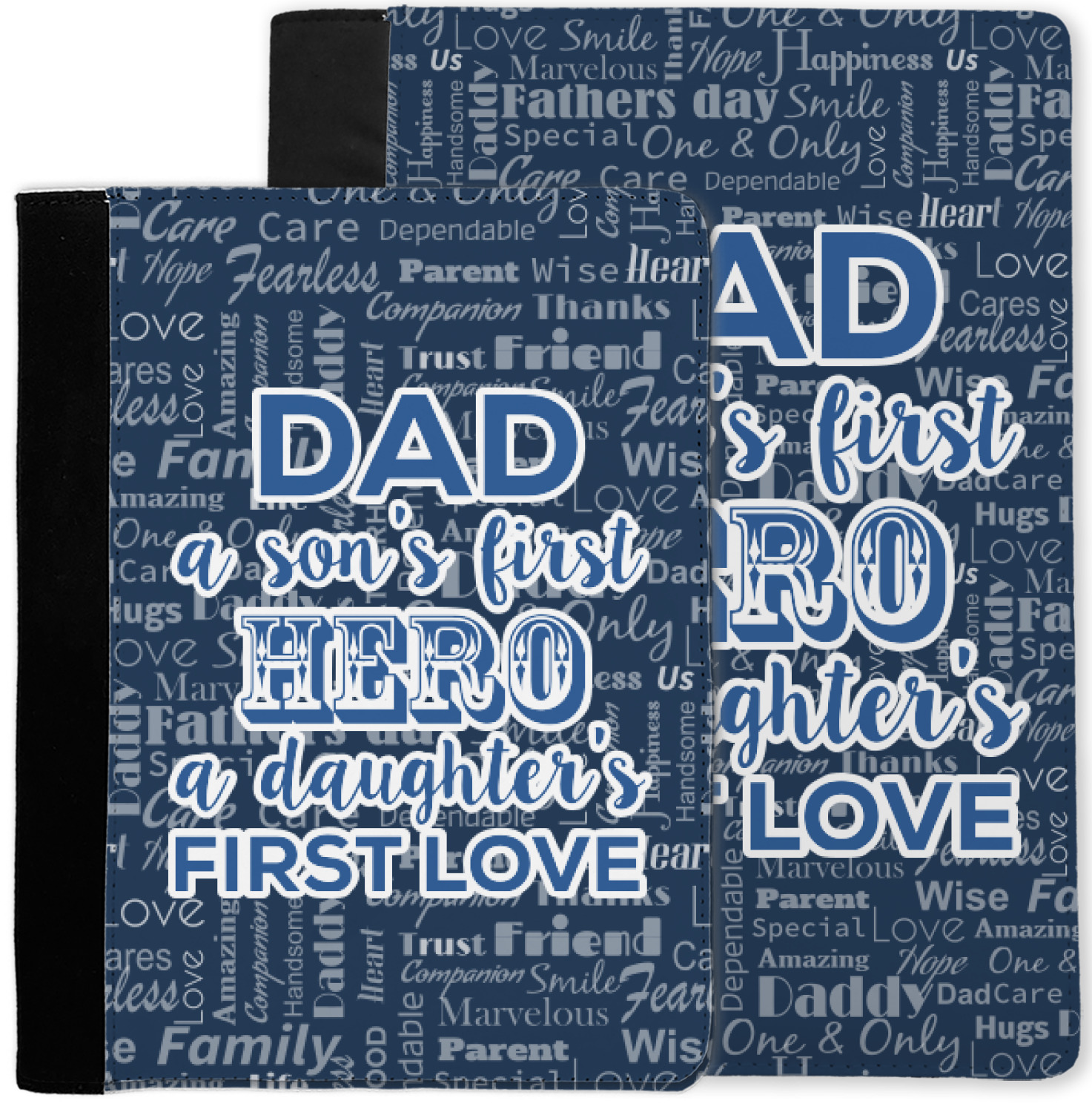 The background of this design is a fun word cloud that says different words to describe a father like "friend," "thanks," "father's day," "happiness," and more. The design is filled with a few different shades of blue and a little accent of white. The main graphic is a quote that says "Dad, a son's first hero, a daughter's first love." What a sweet design for Father's Day!