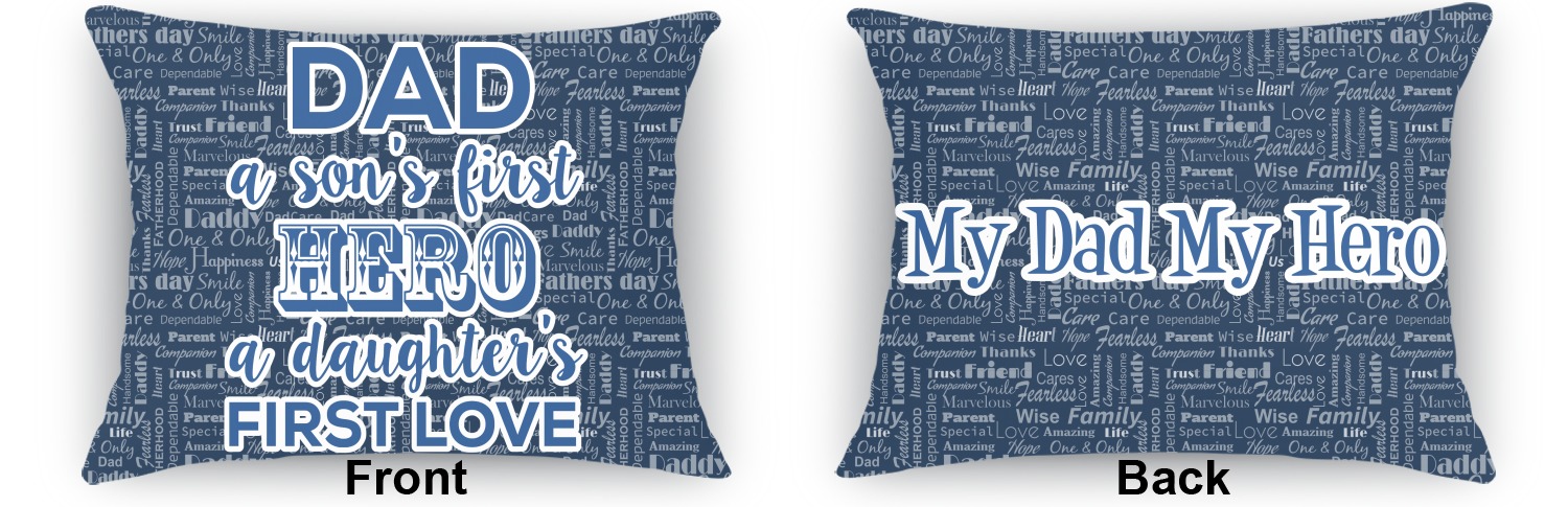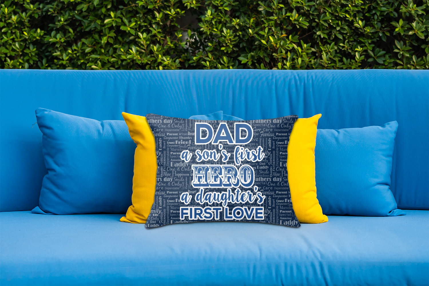 The background of this design is a fun word cloud that says different words to describe a father like "friend," "thanks," "father's day," "happiness," and more. The design is filled with a few different shades of blue and a little accent of white. The main graphic is a quote that says "Dad, a son's first hero, a daughter's first love." What a sweet design for Father's Day!