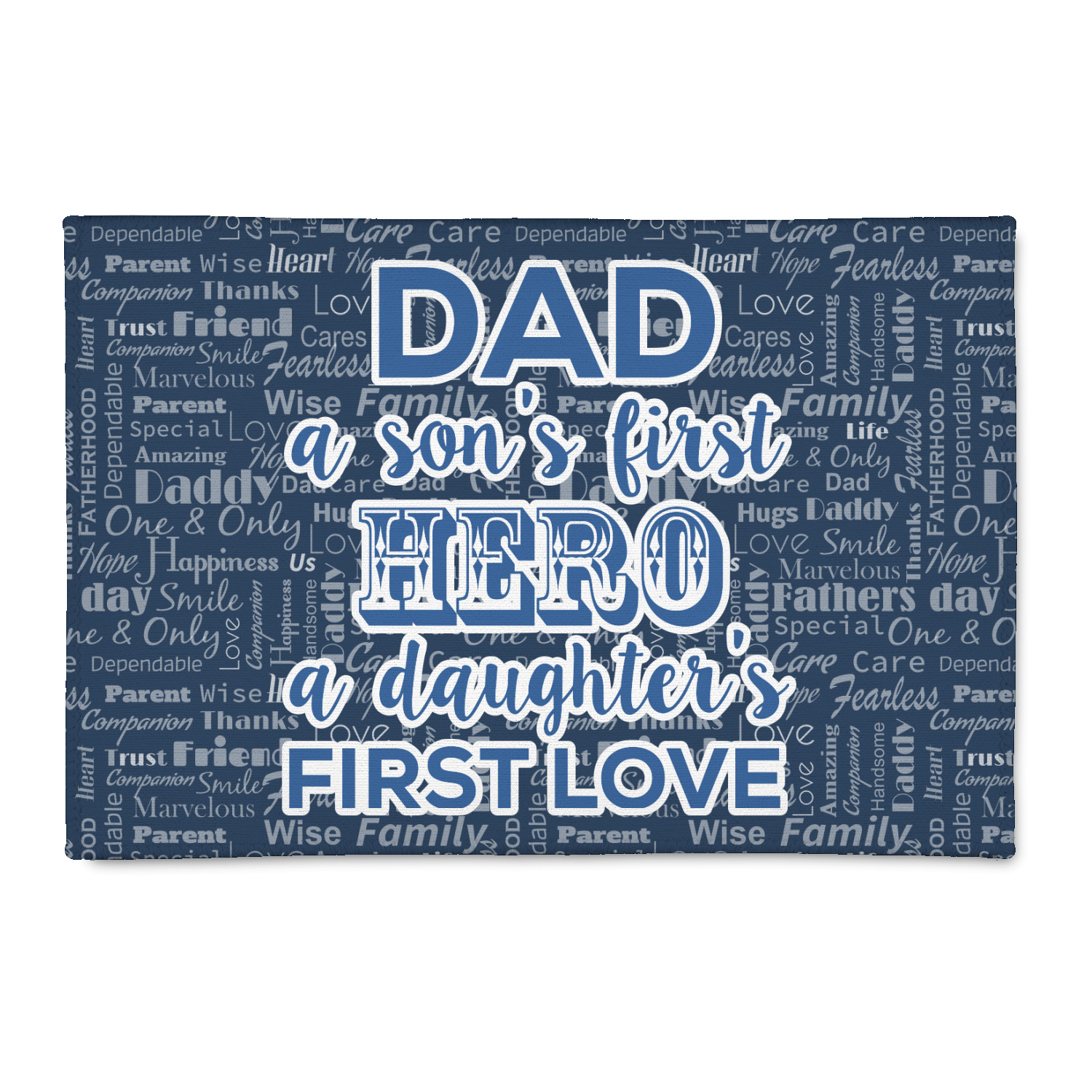 The background of this design is a fun word cloud that says different words to describe a father like "friend," "thanks," "father's day," "happiness," and more. The design is filled with a few different shades of blue and a little accent of white. The main graphic is a quote that says "Dad, a son's first hero, a daughter's first love." What a sweet design for Father's Day!