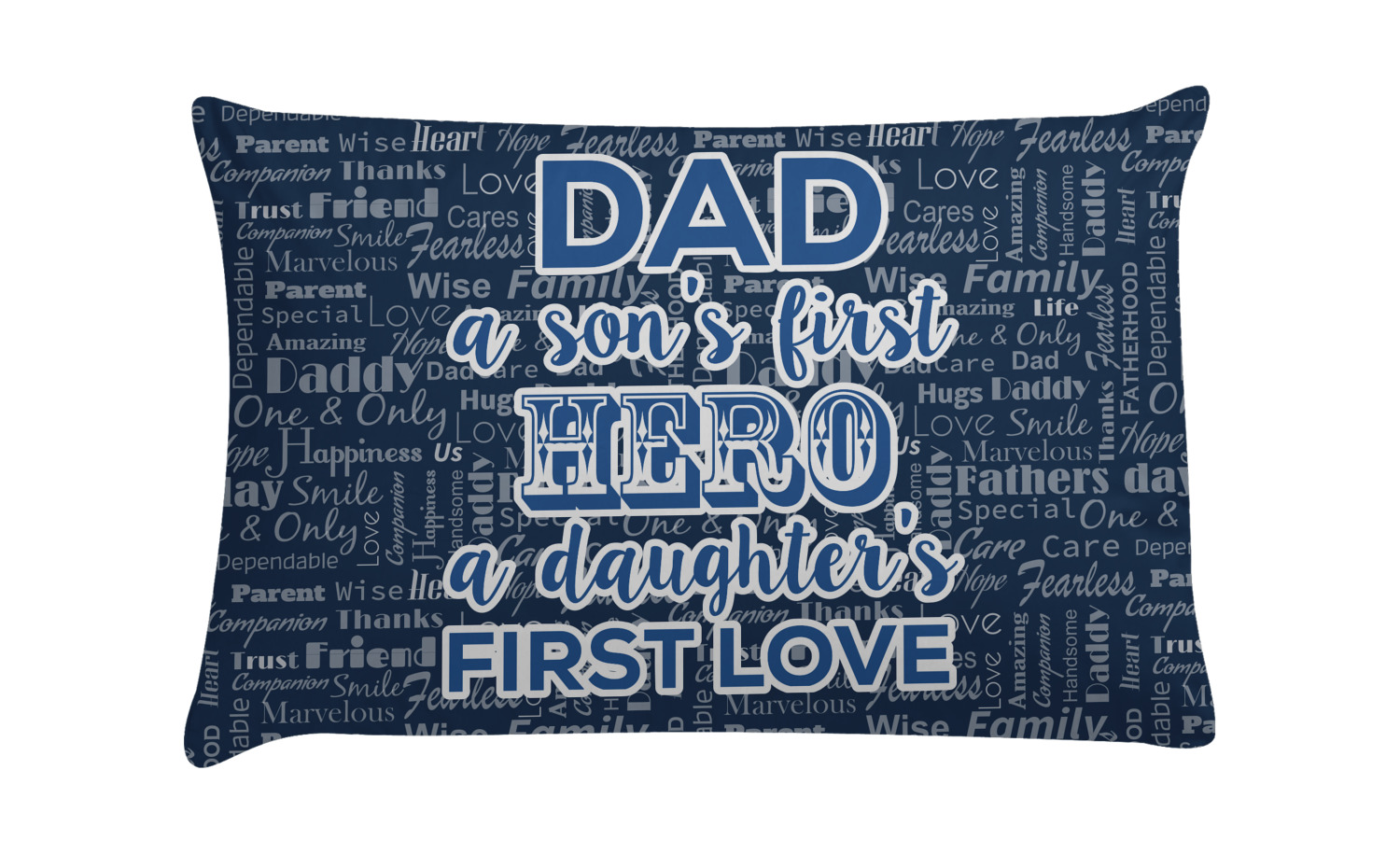 The background of this design is a fun word cloud that says different words to describe a father like "friend," "thanks," "father's day," "happiness," and more. The design is filled with a few different shades of blue and a little accent of white. The main graphic is a quote that says "Dad, a son's first hero, a daughter's first love." What a sweet design for Father's Day!