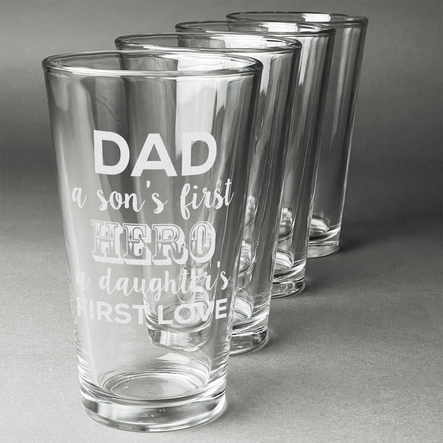 Available in a single glass or a set of 4 - each glass will be custom engraved with your design. Each glass holds 16 oz and measure 5.75"H x 3.5"W.