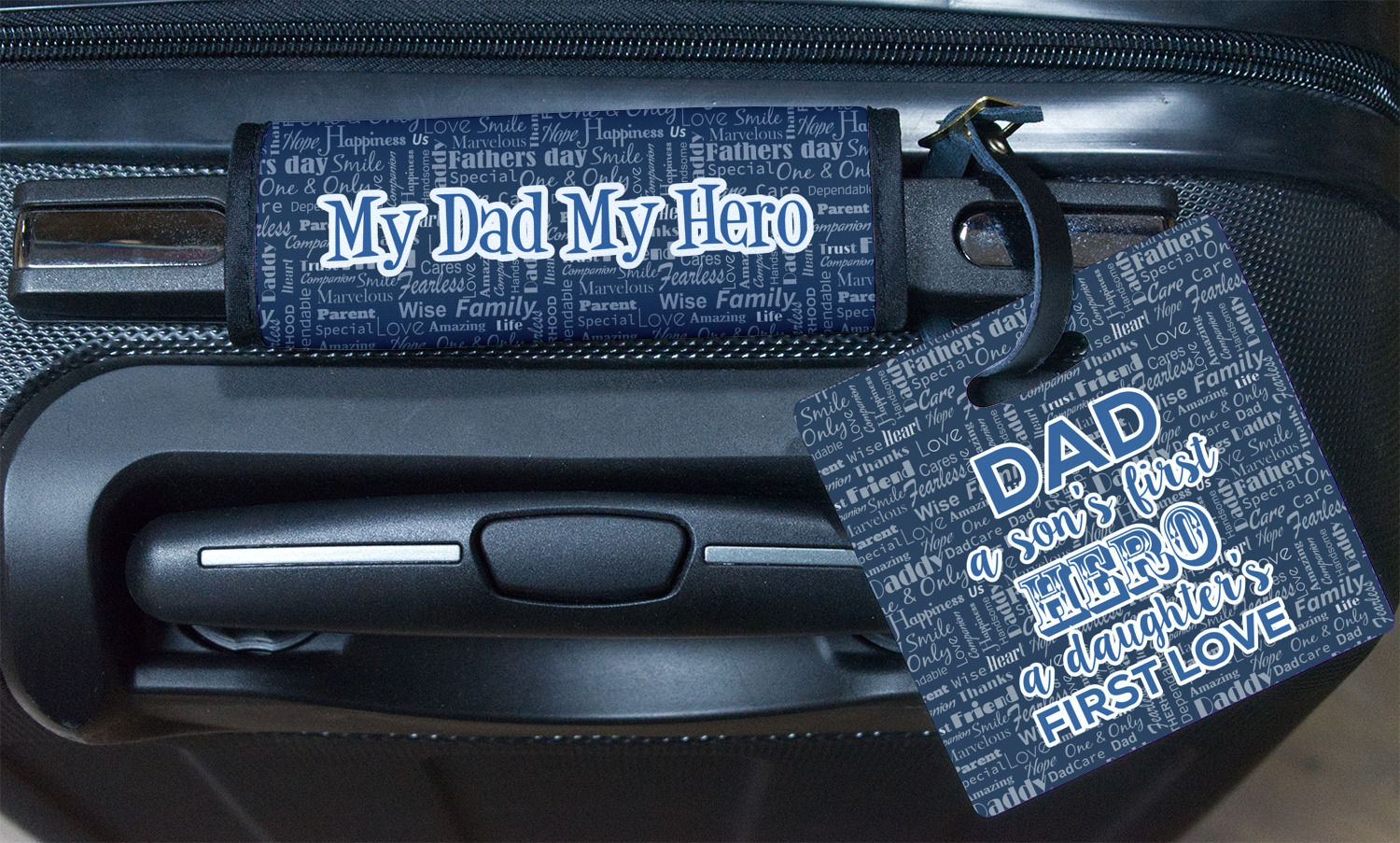 The background of this design is a fun word cloud that says different words to describe a father like "friend," "thanks," "father's day," "happiness," and more. The design is filled with a few different shades of blue and a little accent of white. The main graphic is a quote that says "Dad, a son's first hero, a daughter's first love." What a sweet design for Father's Day!