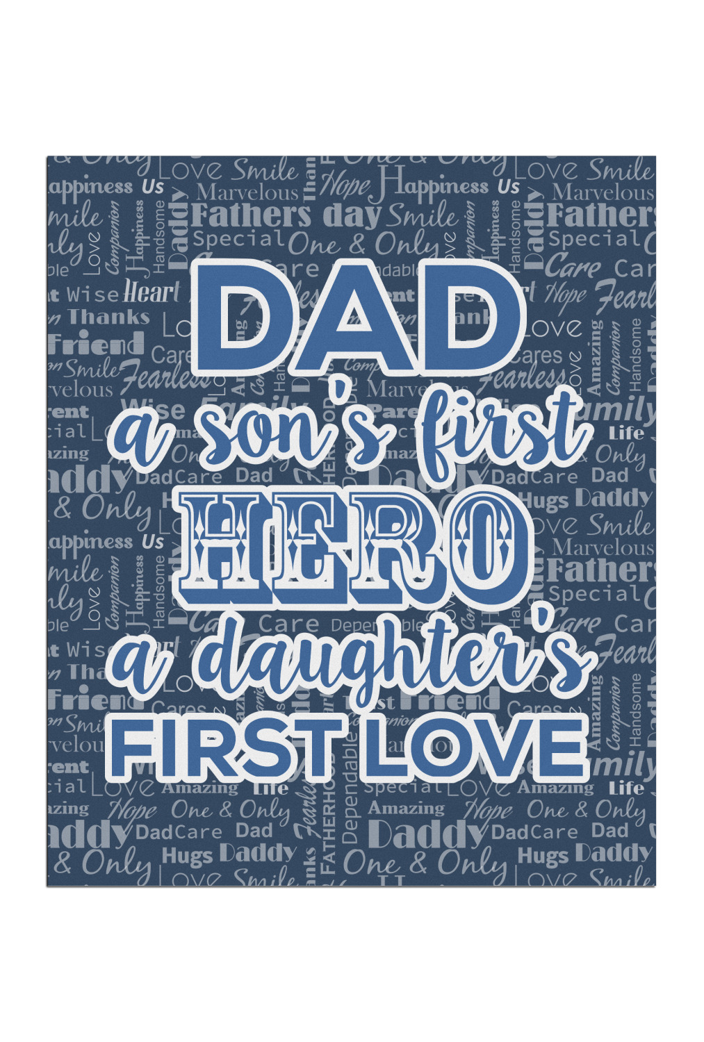 The background of this design is a fun word cloud that says different words to describe a father like "friend," "thanks," "father's day," "happiness," and more. The design is filled with a few different shades of blue and a little accent of white. The main graphic is a quote that says "Dad, a son's first hero, a daughter's first love." What a sweet design for Father's Day!