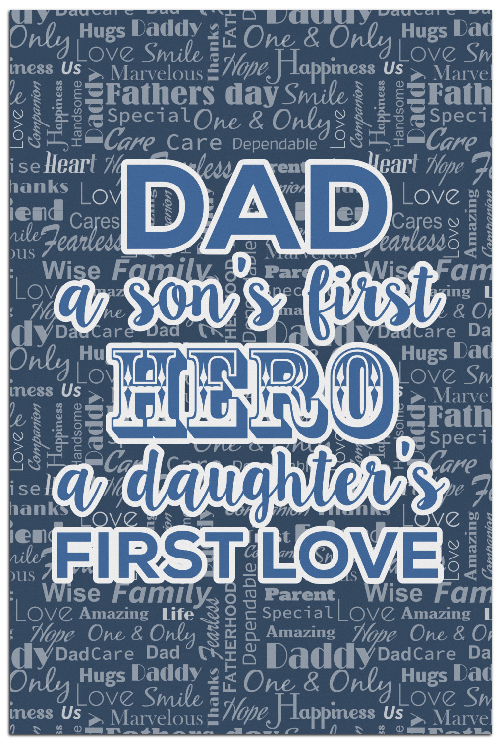 The background of this design is a fun word cloud that says different words to describe a father like "friend," "thanks," "father's day," "happiness," and more. The design is filled with a few different shades of blue and a little accent of white. The main graphic is a quote that says "Dad, a son's first hero, a daughter's first love." What a sweet design for Father's Day!