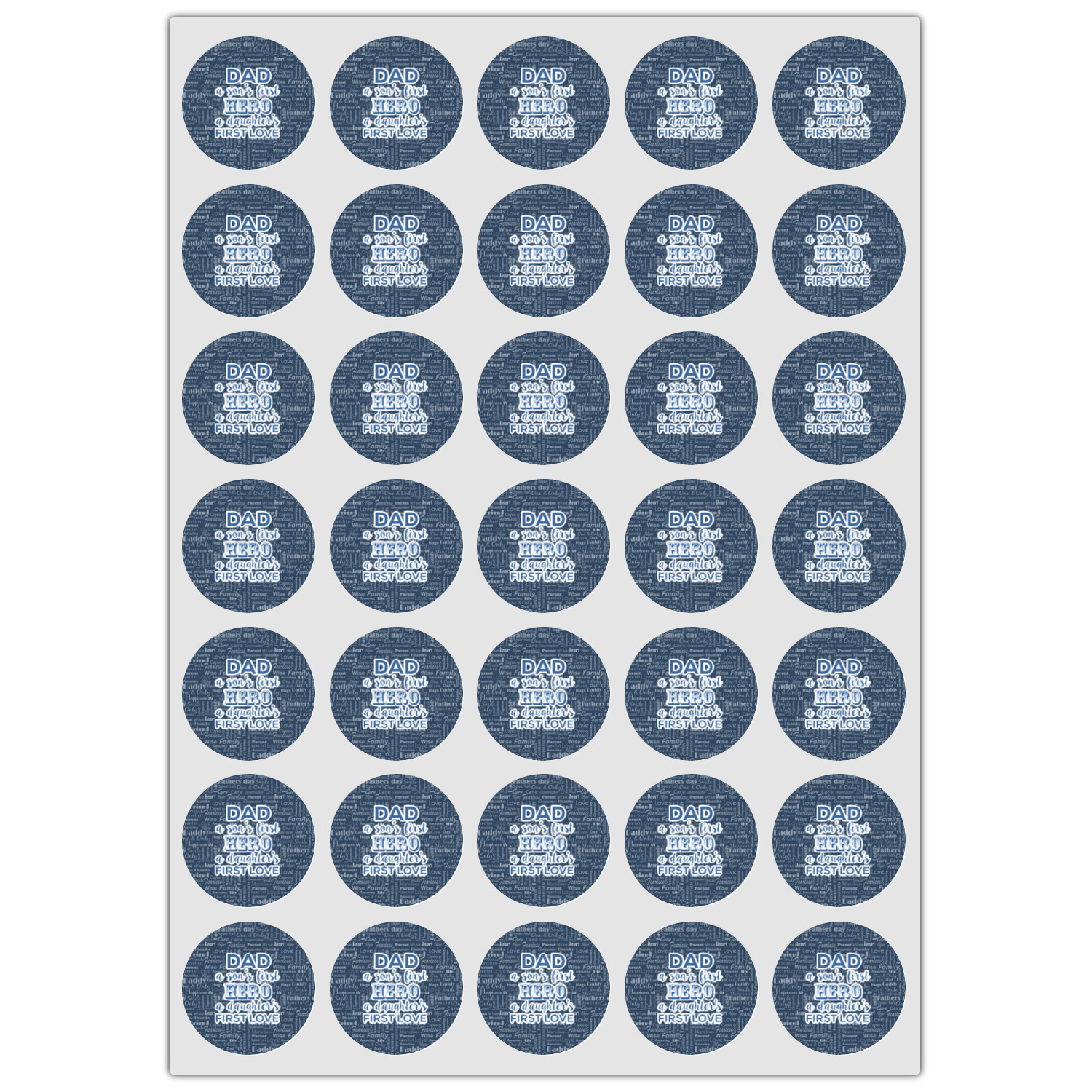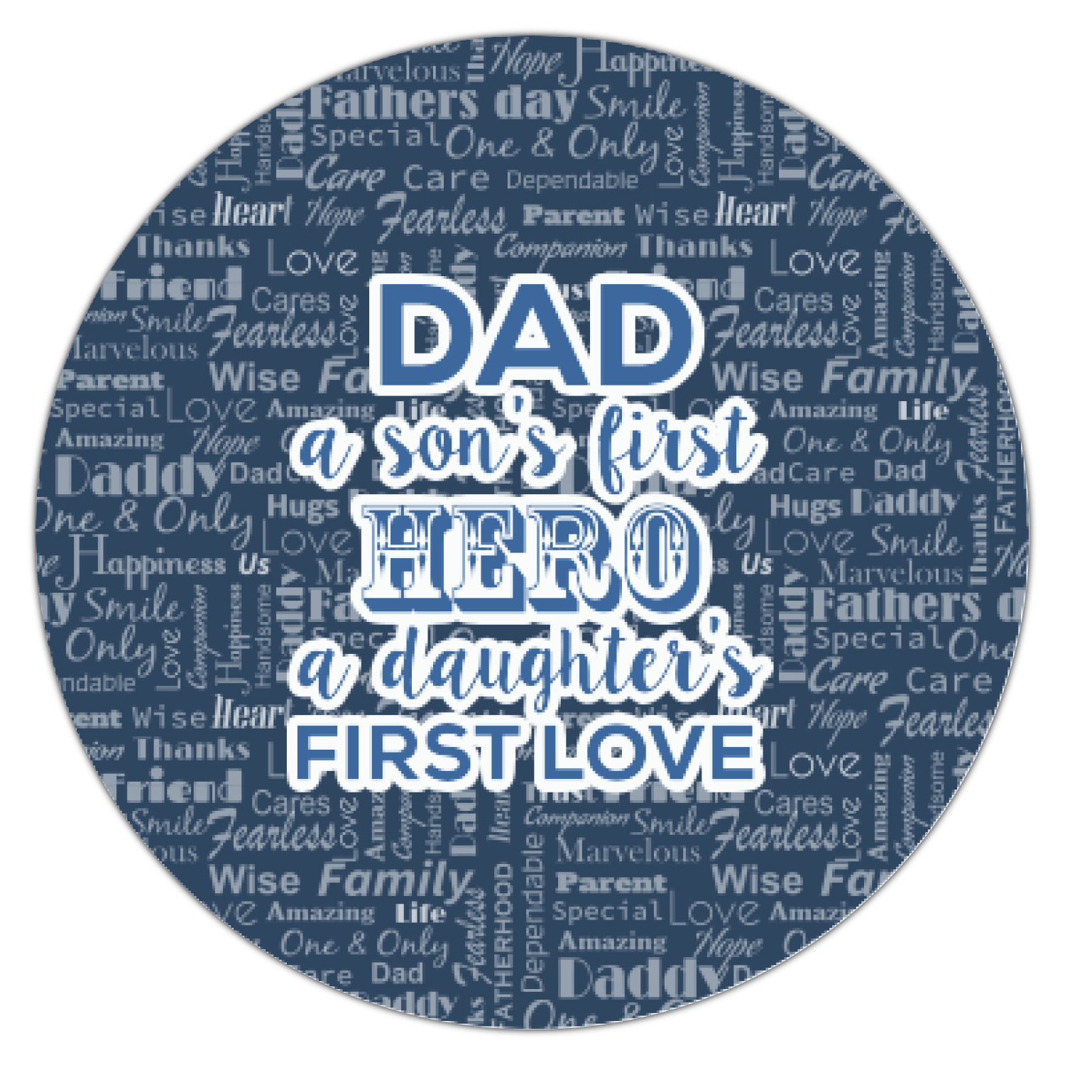 The background of this design is a fun word cloud that says different words to describe a father like "friend," "thanks," "father's day," "happiness," and more. The design is filled with a few different shades of blue and a little accent of white. The main graphic is a quote that says "Dad, a son's first hero, a daughter's first love." What a sweet design for Father's Day!