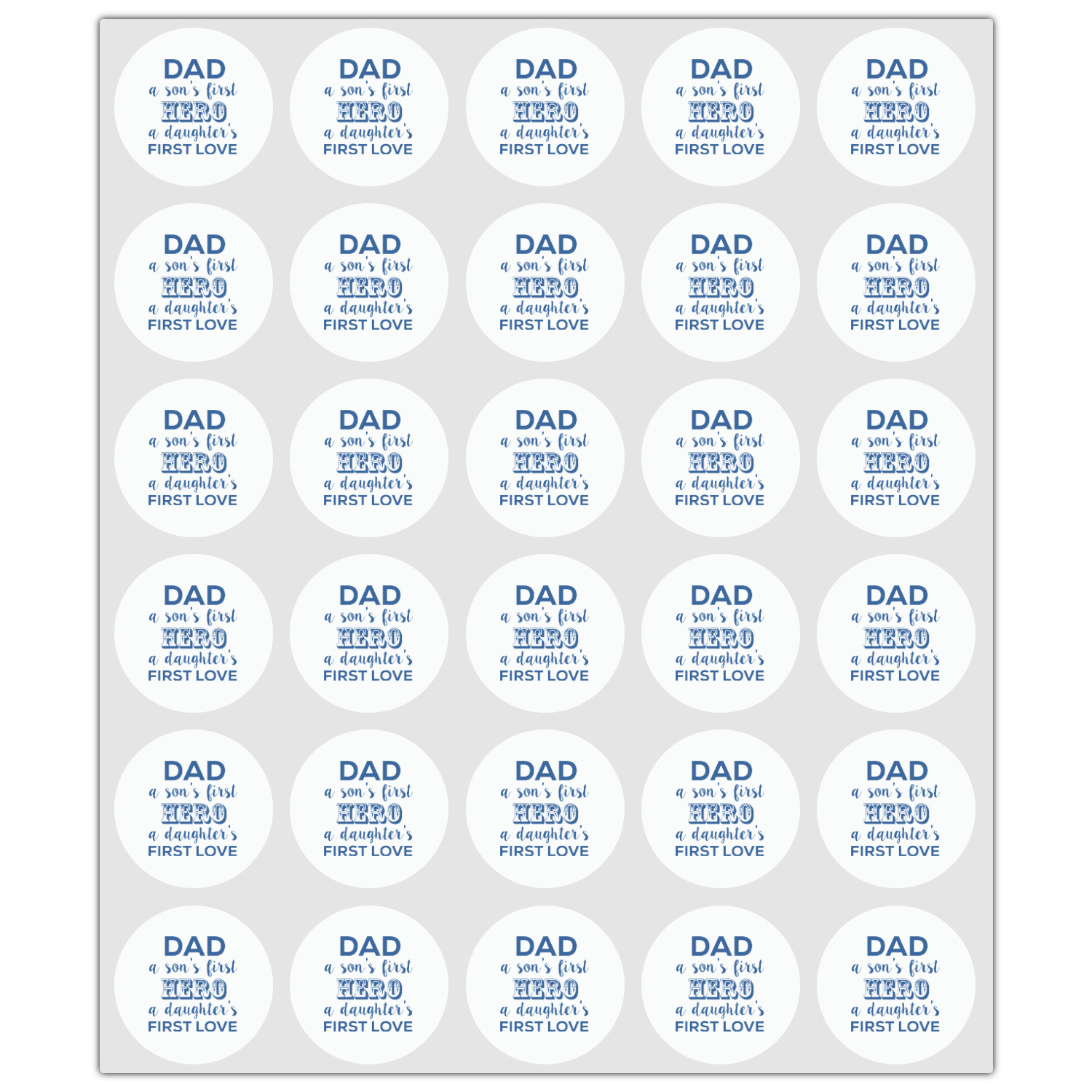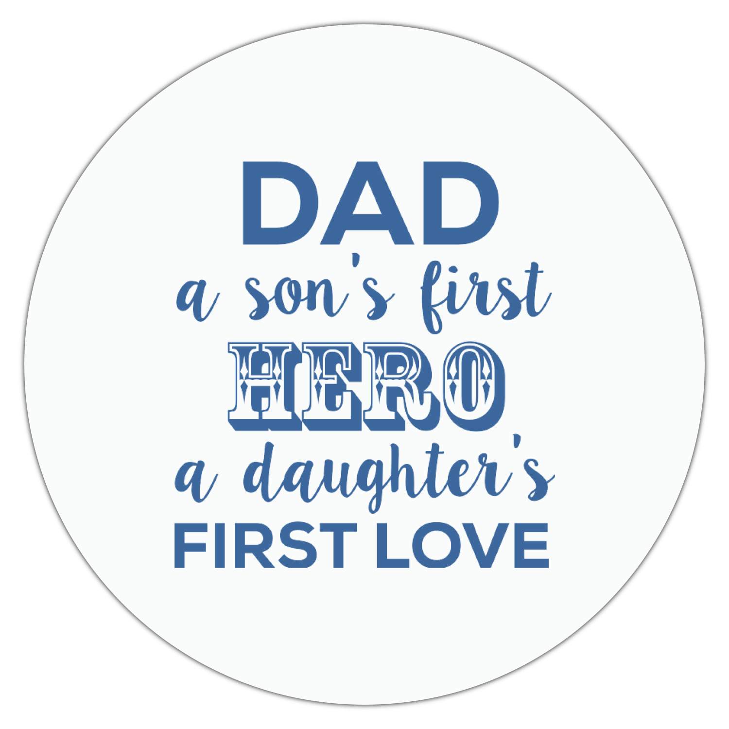 The background of this design is a fun word cloud that says different words to describe a father like "friend," "thanks," "father's day," "happiness," and more. The design is filled with a few different shades of blue and a little accent of white. The main graphic is a quote that says "Dad, a son's first hero, a daughter's first love." What a sweet design for Father's Day!