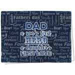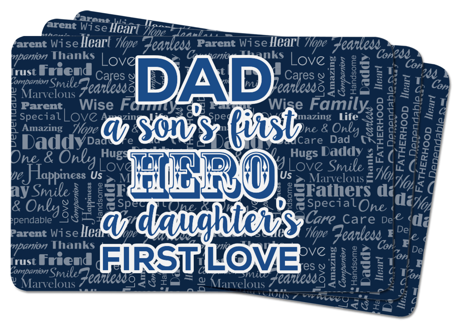 The background of this design is a fun word cloud that says different words to describe a father like "friend," "thanks," "father's day," "happiness," and more. The design is filled with a few different shades of blue and a little accent of white. The main graphic is a quote that says "Dad, a son's first hero, a daughter's first love." What a sweet design for Father's Day!