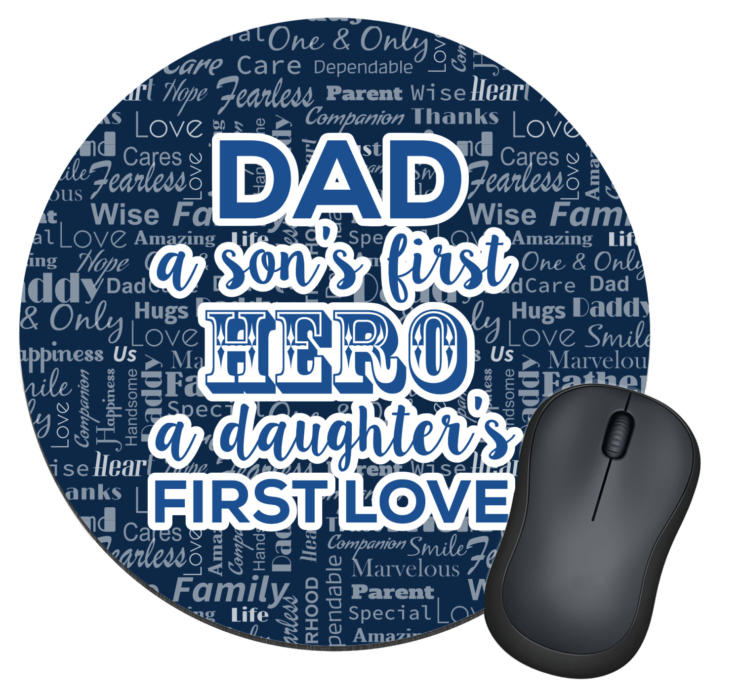 The background of this design is a fun word cloud that says different words to describe a father like "friend," "thanks," "father's day," "happiness," and more. The design is filled with a few different shades of blue and a little accent of white. The main graphic is a quote that says "Dad, a son's first hero, a daughter's first love." What a sweet design for Father's Day!