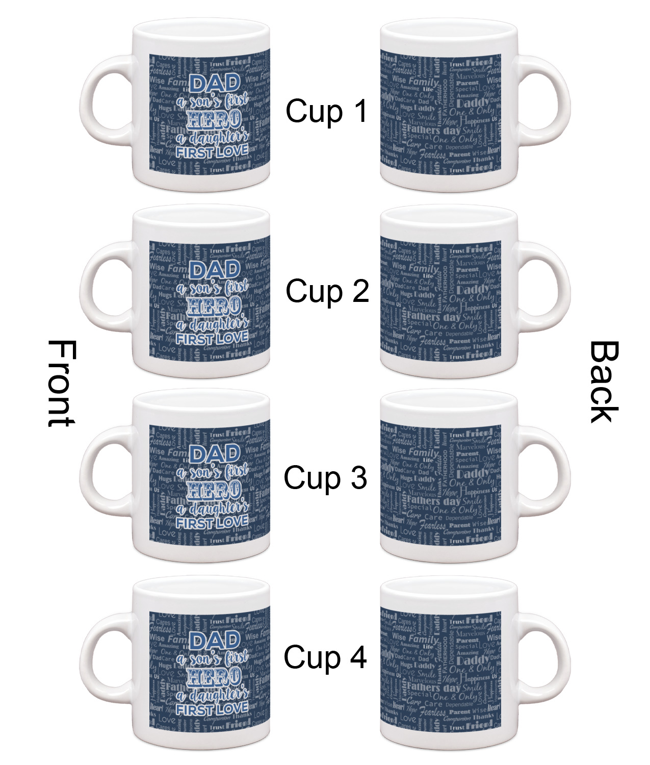 Each of our espresso mugs is a ceramic material sure to keep your drink warm. Personalize one cup for yourself, or order a set of 4! Its the perfect little gift for any coffee lover! We carry two sizes for you to personalize - 3 oz. (approx. 3.25" x 2.325" x 2.625") or 6 oz. (approx. 4" x 2.9" x 2.9"). Our 3 oz. mug is perfect for that single shot espresso while our 6 oz. mug can be your next favorite cappuccino cup holding two shots of espresso!
