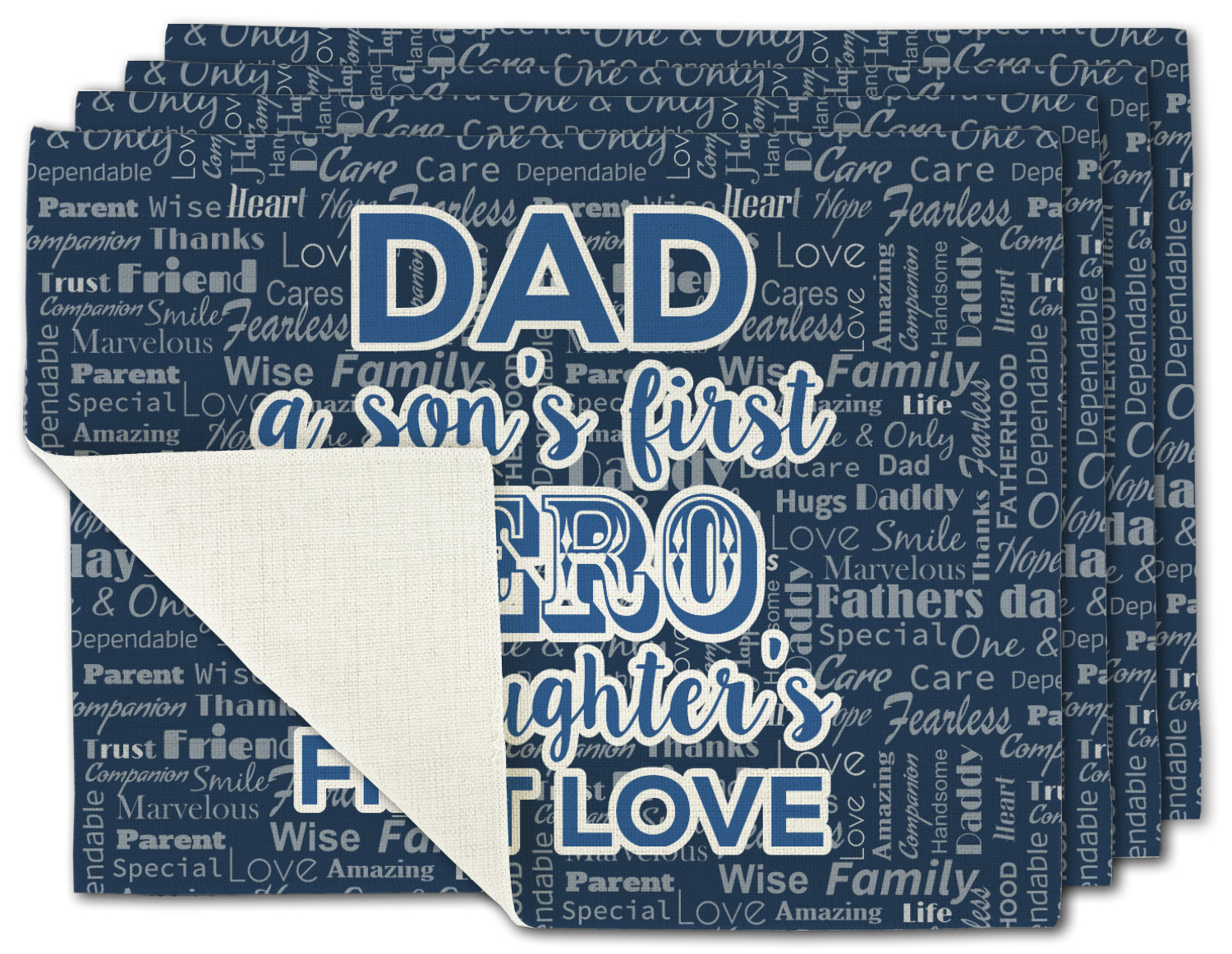 The background of this design is a fun word cloud that says different words to describe a father like "friend," "thanks," "father's day," "happiness," and more. The design is filled with a few different shades of blue and a little accent of white. The main graphic is a quote that says "Dad, a son's first hero, a daughter's first love." What a sweet design for Father's Day!