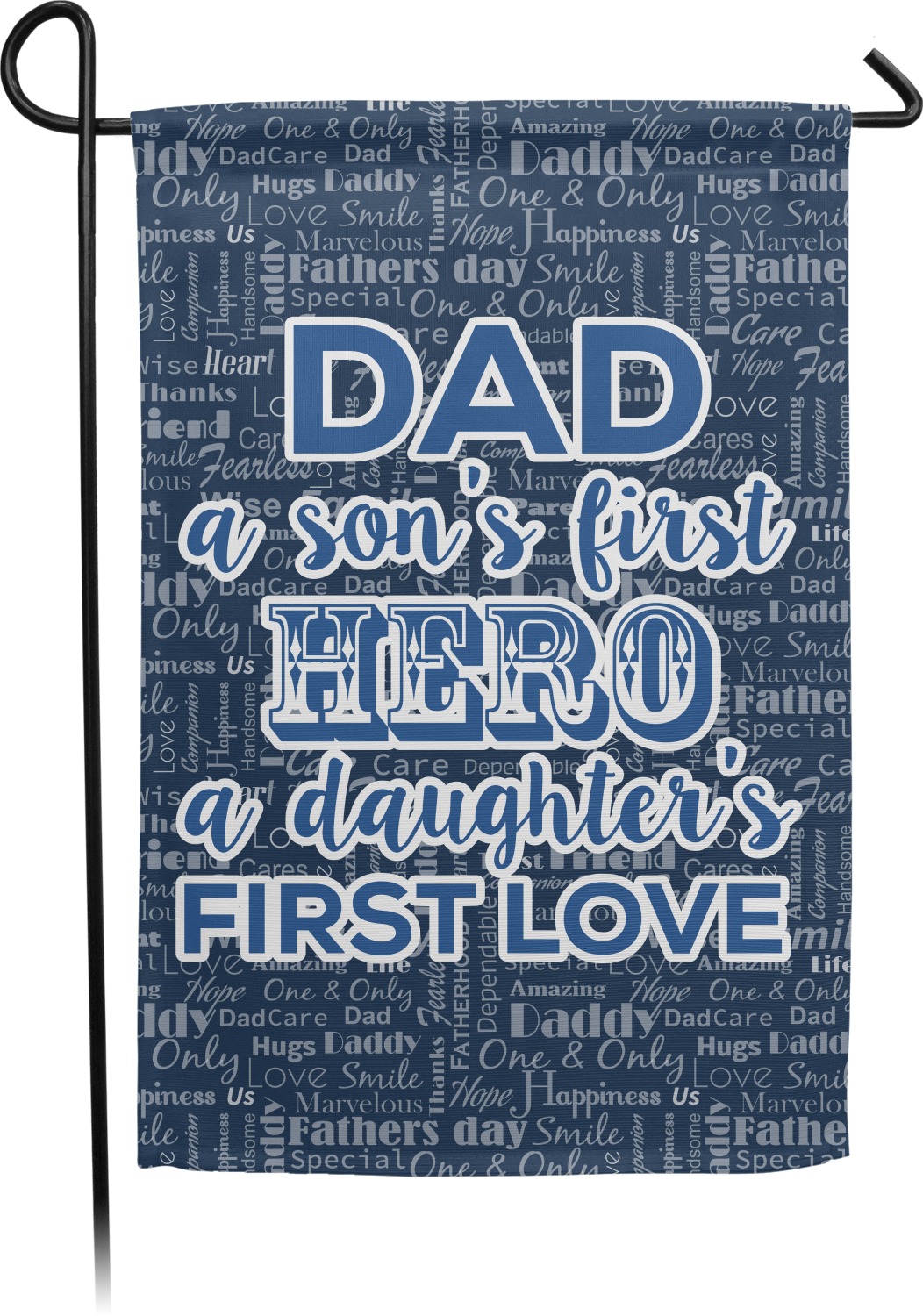 The background of this design is a fun word cloud that says different words to describe a father like "friend," "thanks," "father's day," "happiness," and more. The design is filled with a few different shades of blue and a little accent of white. The main graphic is a quote that says "Dad, a son's first hero, a daughter's first love." What a sweet design for Father's Day!
