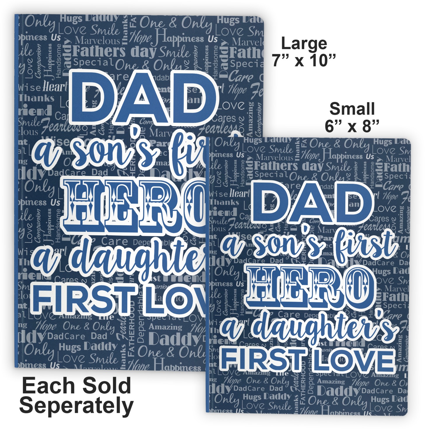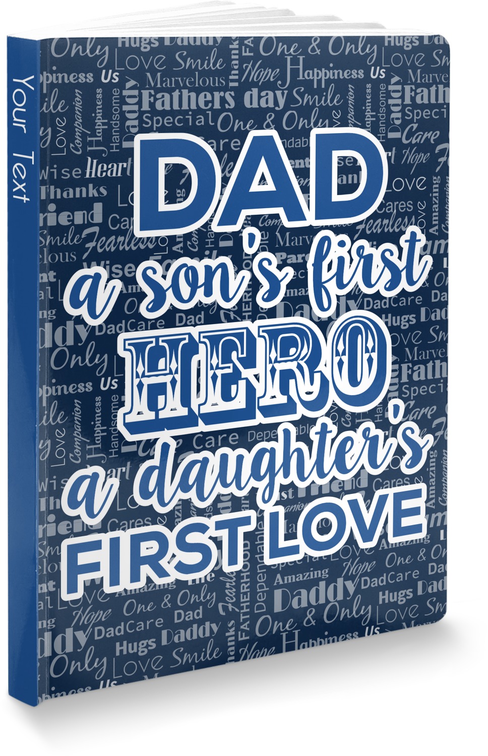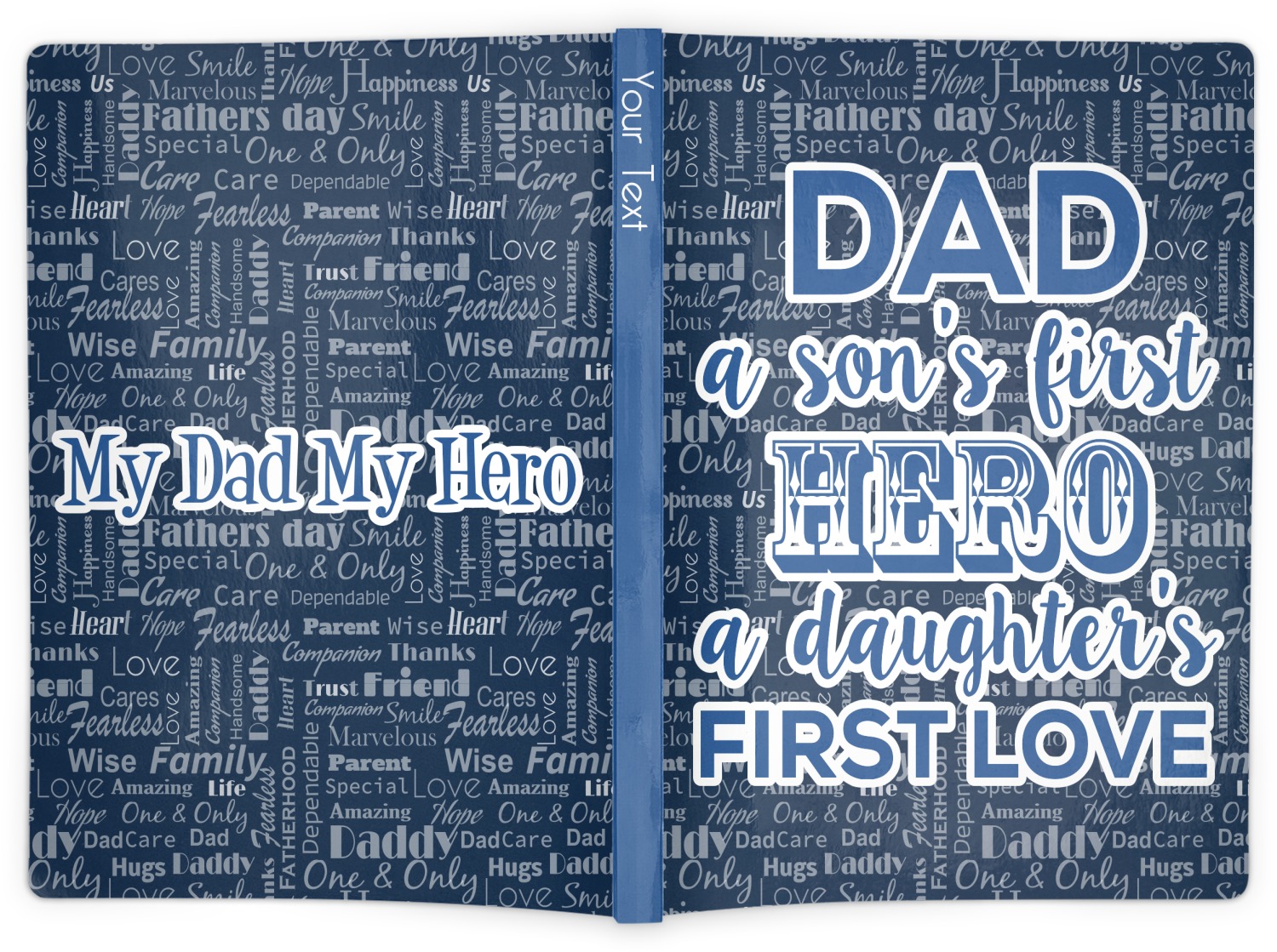 The background of this design is a fun word cloud that says different words to describe a father like "friend," "thanks," "father's day," "happiness," and more. The design is filled with a few different shades of blue and a little accent of white. The main graphic is a quote that says "Dad, a son's first hero, a daughter's first love." What a sweet design for Father's Day!
