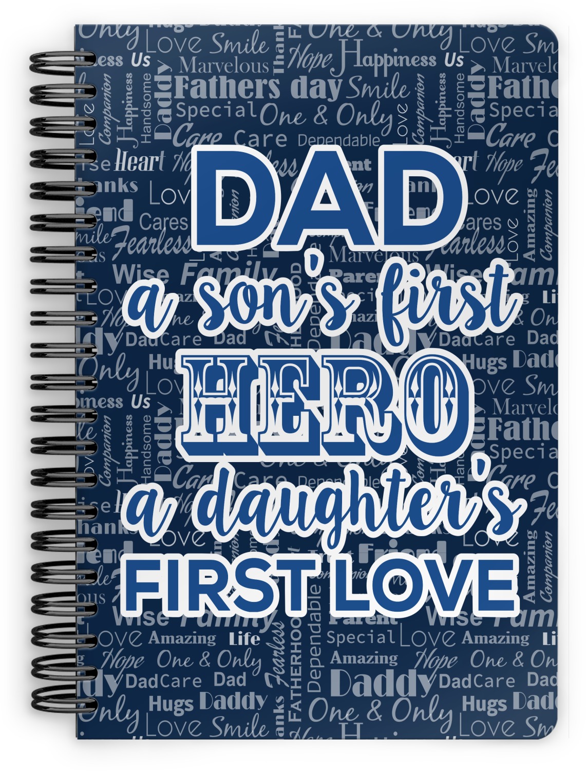 The background of this design is a fun word cloud that says different words to describe a father like "friend," "thanks," "father's day," "happiness," and more. The design is filled with a few different shades of blue and a little accent of white. The main graphic is a quote that says "Dad, a son's first hero, a daughter's first love." What a sweet design for Father's Day!