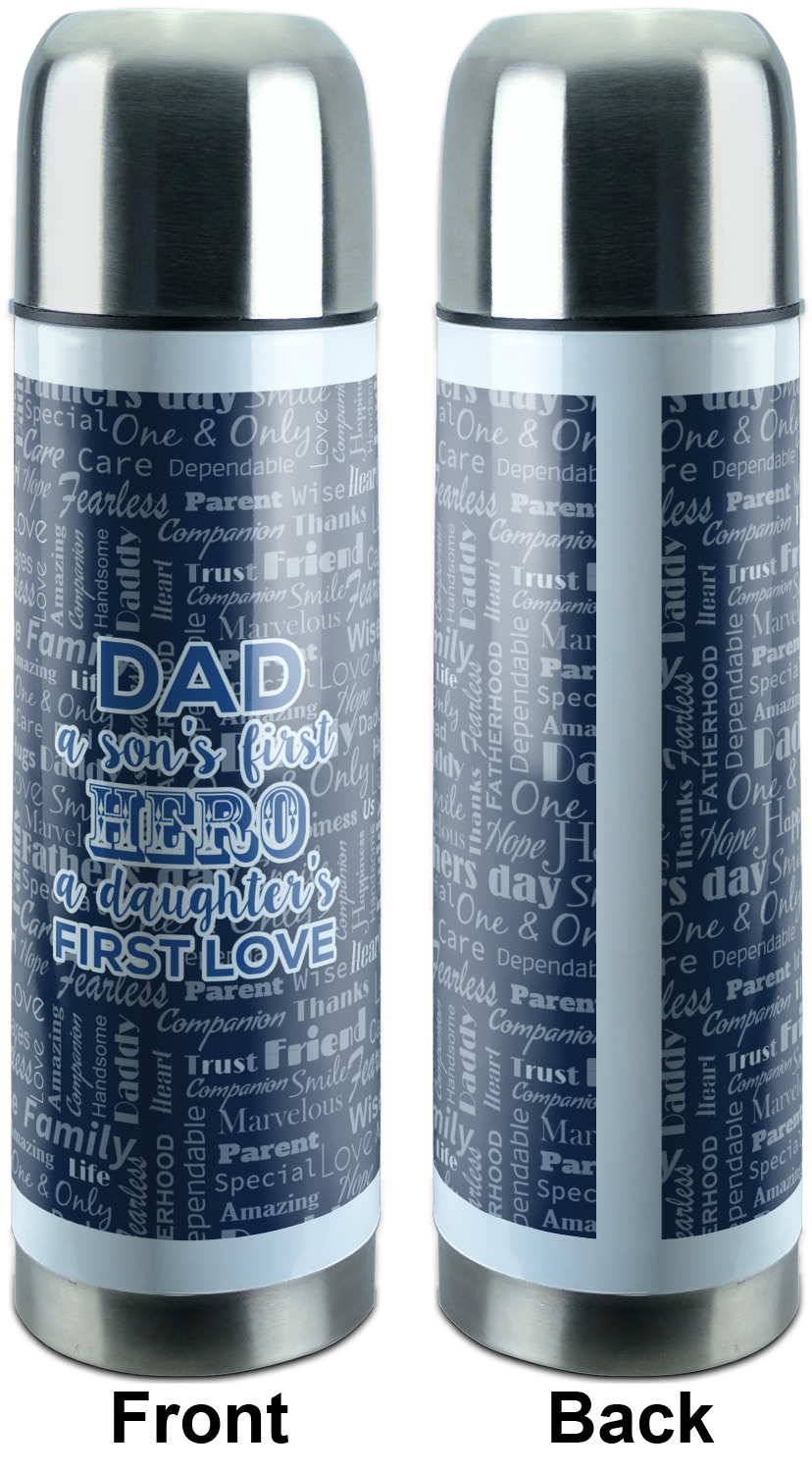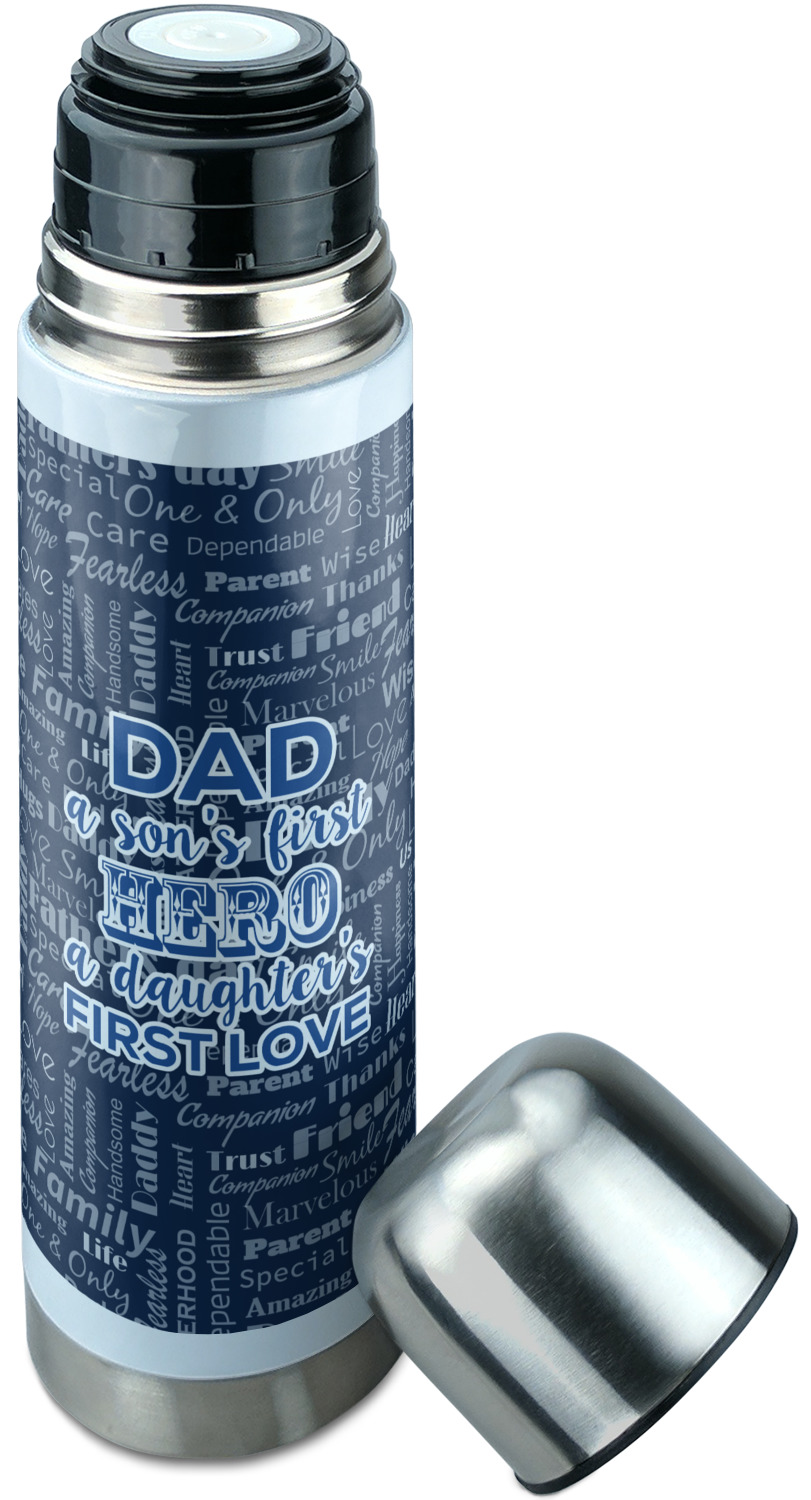 Manufactured from stainless steel, this thermos is built durably and double-walled insulated to preserve the temperature of your drink for hours. It also features a screw off lid that is made to also function as a small cup. Upon unscrewing this part of the thermos bottle, a pop-open, pour feature emerges. This feature allows you to slowly pour your beverage into your lid, ensuring a steady, controlled pour into your lid or other cup. With a capacity of 25 ounces, these large thermoses can hold several servings of your favorite beverage. Your customization is displayed all around the bottle with bright, vibrant color.