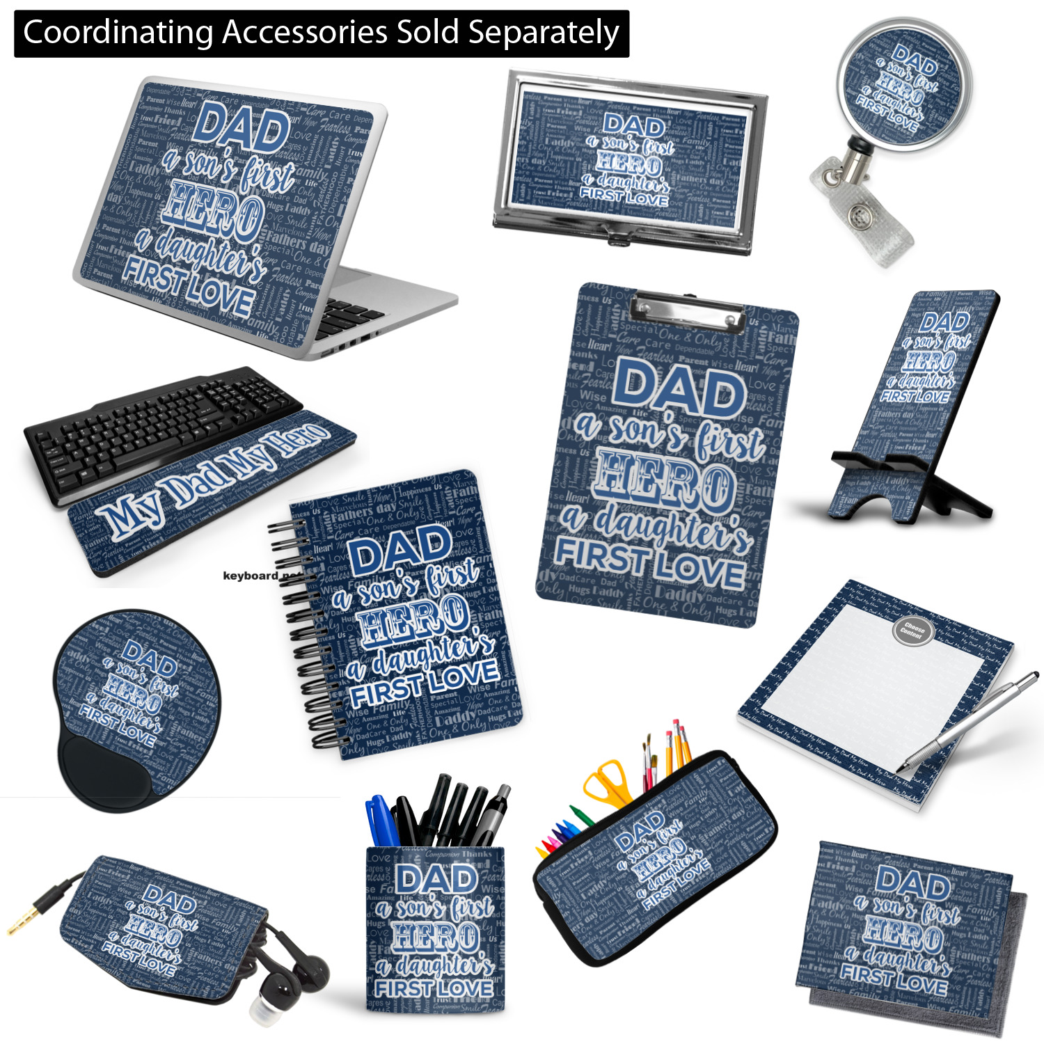 The background of this design is a fun word cloud that says different words to describe a father like "friend," "thanks," "father's day," "happiness," and more. The design is filled with a few different shades of blue and a little accent of white. The main graphic is a quote that says "Dad, a son's first hero, a daughter's first love." What a sweet design for Father's Day!