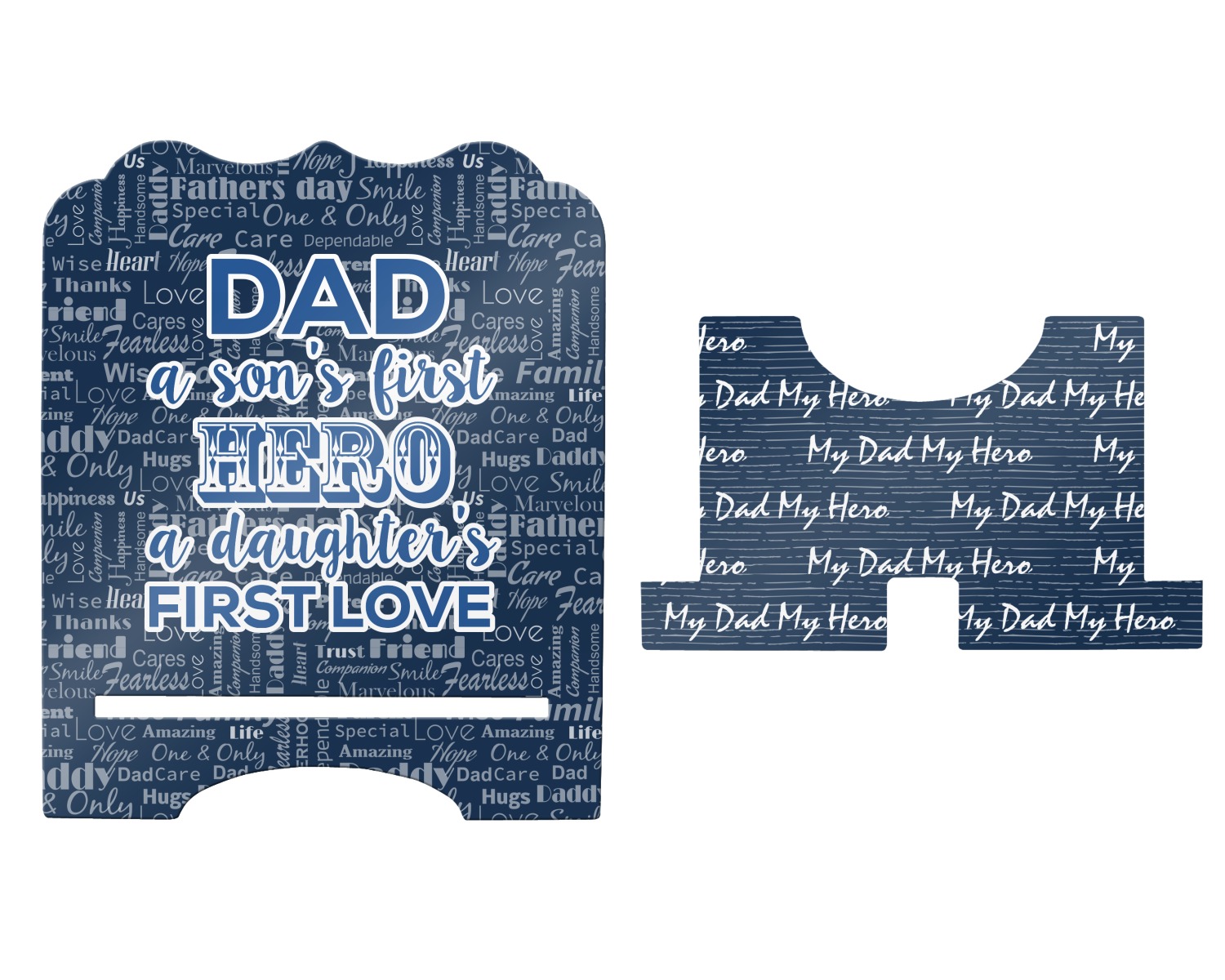 The background of this design is a fun word cloud that says different words to describe a father like "friend," "thanks," "father's day," "happiness," and more. The design is filled with a few different shades of blue and a little accent of white. The main graphic is a quote that says "Dad, a son's first hero, a daughter's first love." What a sweet design for Father's Day!