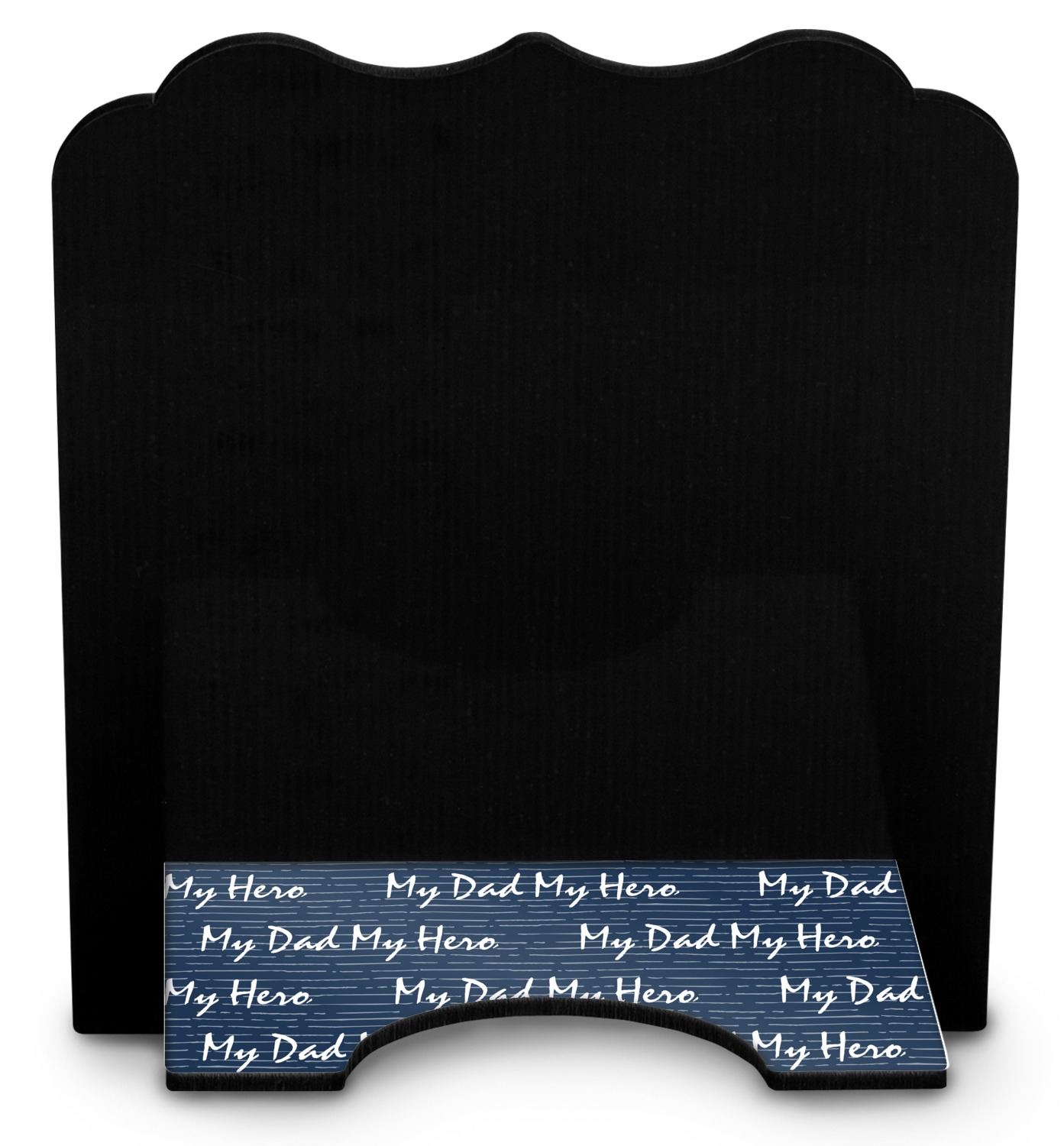 The stand is comprised of two hardboard pieces that fit snugly together and stabilize one another. The bottom part of the iPad stand supports your tablet, and has space for your tablets charger while in use. At 9.25" x 11.5", this tablet mount can support a device between the sizes of the iPad Pro and the iPad Mini 2. The uppermost part of the stand features a decorative, curved edge for a classy, suave appearance. We print your customization atop the face of the stand, in vibrant color. The remaining sides are colored a sleek black.