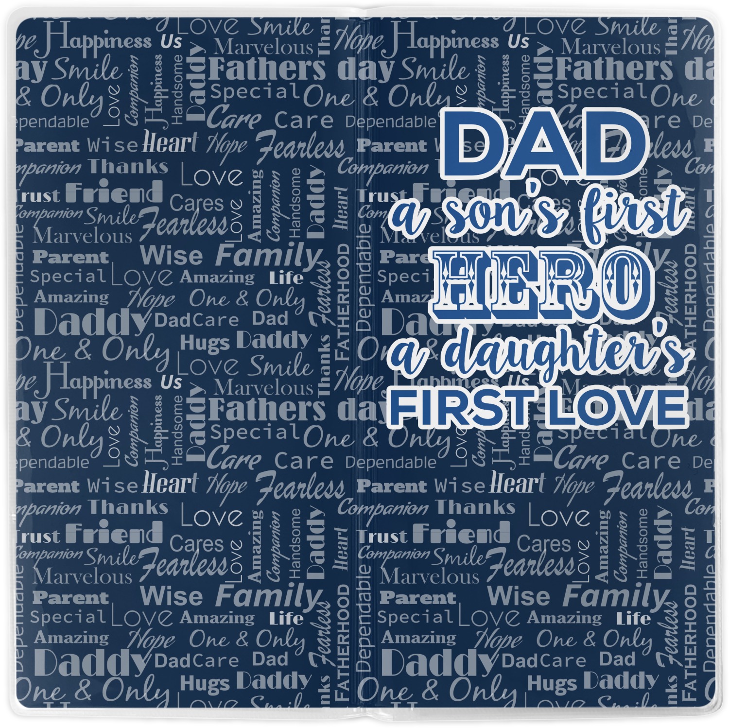 The background of this design is a fun word cloud that says different words to describe a father like "friend," "thanks," "father's day," "happiness," and more. The design is filled with a few different shades of blue and a little accent of white. The main graphic is a quote that says "Dad, a son's first hero, a daughter's first love." What a sweet design for Father's Day!