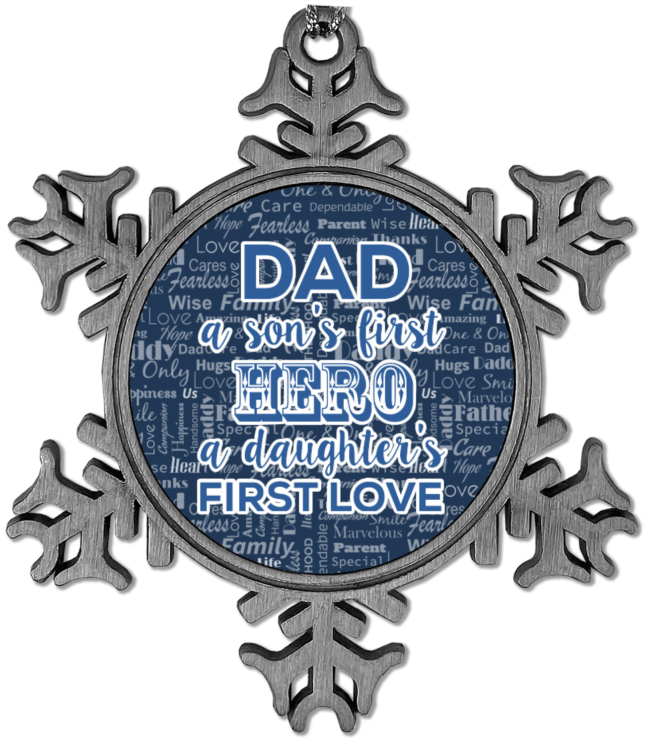 The snowflake shape ornament is an everlasting pewter material with a circular center to display your photo or design, giving it a unique vintage ornament look. Our personalized Christmas ornament comes in a small gift box for keepsake sure to preserve your picture ornament until the next holiday season. The snowflake shape is approximately 3 x 3 with a small silver accent string perfect for hanging. We print your photo or design in the center of the ornament with a size that is roughly 1.75 in diameter.