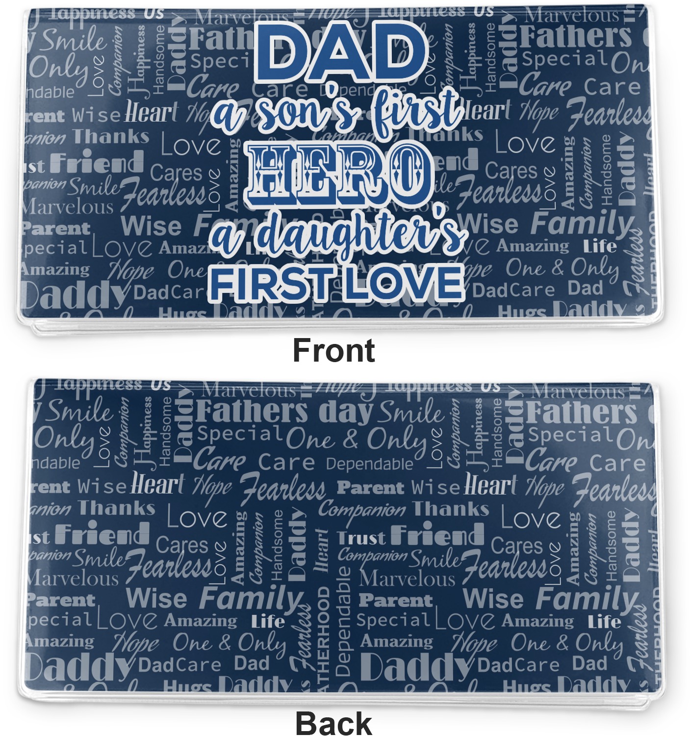 The background of this design is a fun word cloud that says different words to describe a father like "friend," "thanks," "father's day," "happiness," and more. The design is filled with a few different shades of blue and a little accent of white. The main graphic is a quote that says "Dad, a son's first hero, a daughter's first love." What a sweet design for Father's Day!