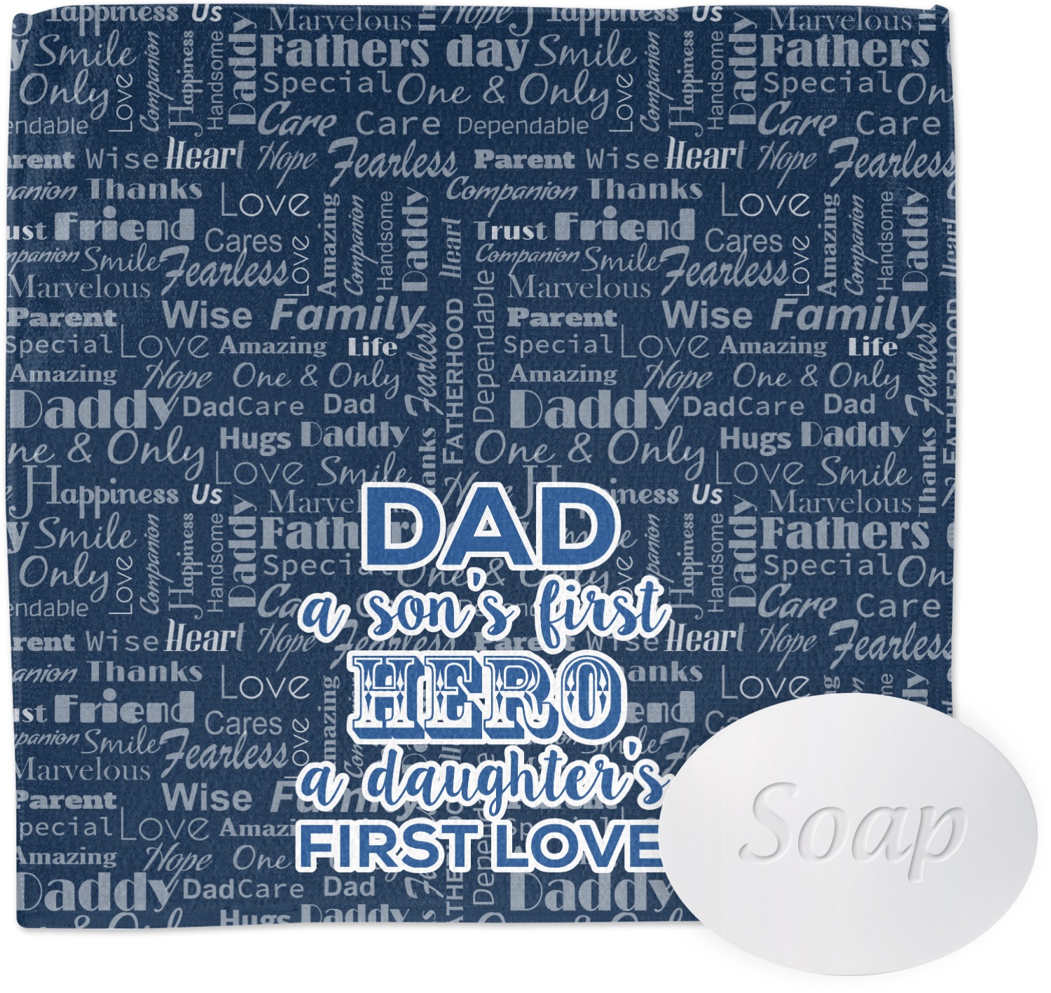 The background of this design is a fun word cloud that says different words to describe a father like "friend," "thanks," "father's day," "happiness," and more. The design is filled with a few different shades of blue and a little accent of white. The main graphic is a quote that says "Dad, a son's first hero, a daughter's first love." What a sweet design for Father's Day!