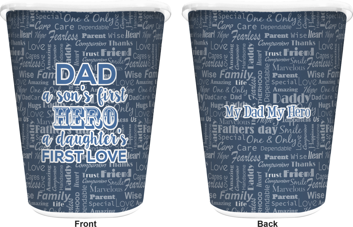 The background of this design is a fun word cloud that says different words to describe a father like "friend," "thanks," "father's day," "happiness," and more. The design is filled with a few different shades of blue and a little accent of white. The main graphic is a quote that says "Dad, a son's first hero, a daughter's first love." What a sweet design for Father's Day!