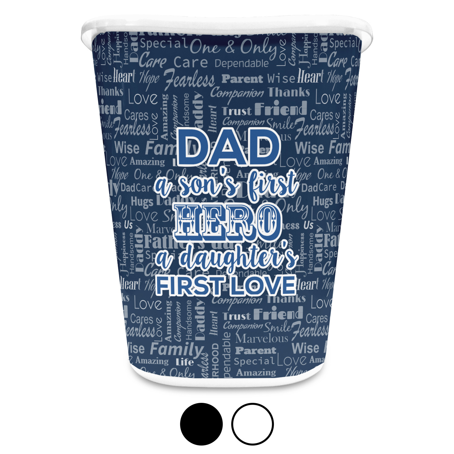 You can choose to purchase these decorative wastebaskets in either a white or a black color that will show on the base and the upper rim. Your customization is printed on a high-gloss, fine-quality vinyl adhesive, and you can choose to either have this adhesive applied to one side only or to both sides. As such, this plastic wastebasket can be single-sided or double-sided, depending on your creative vision. Your customization is printed using durable inks, making the design waterproof and resistant to fading over time.