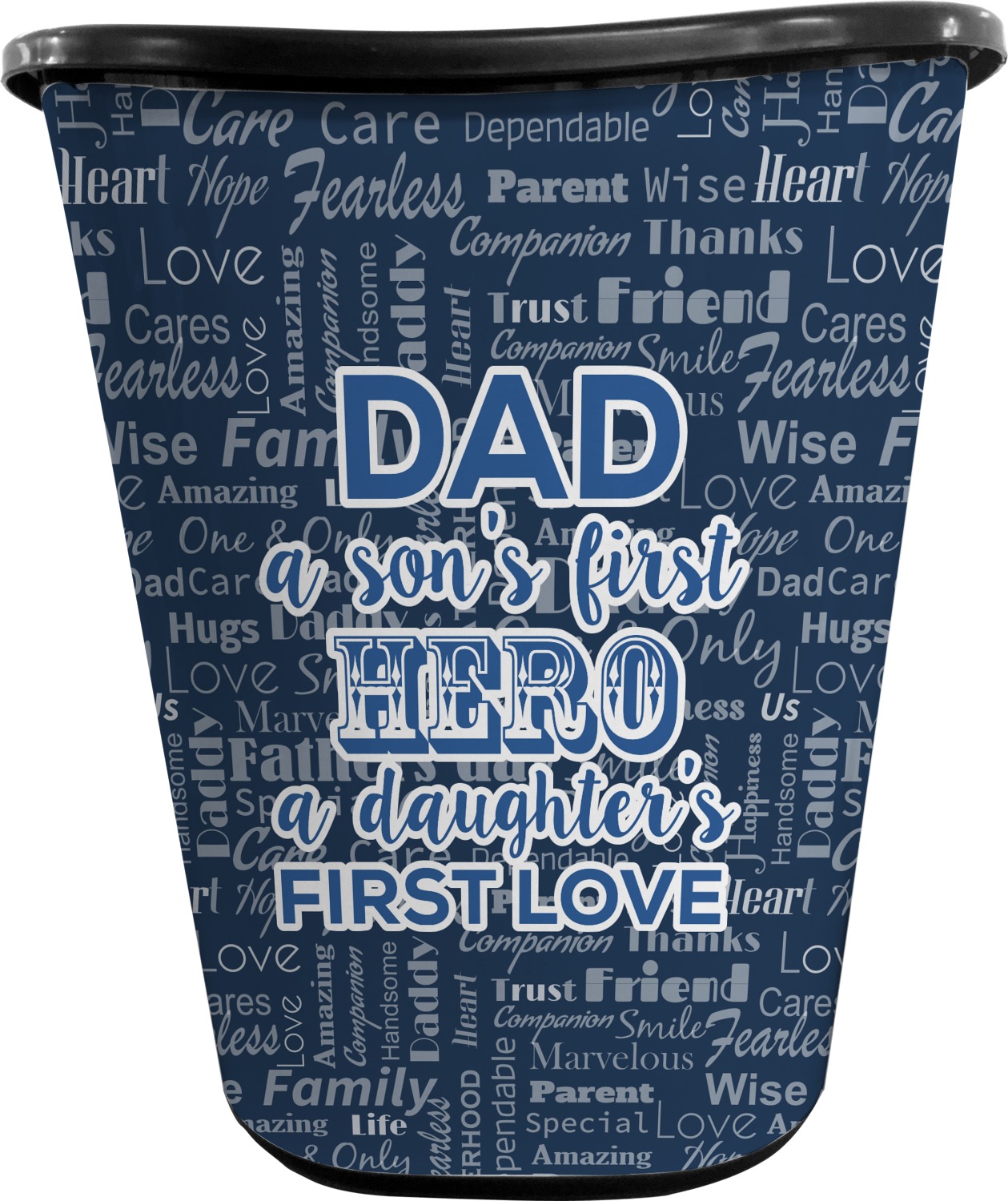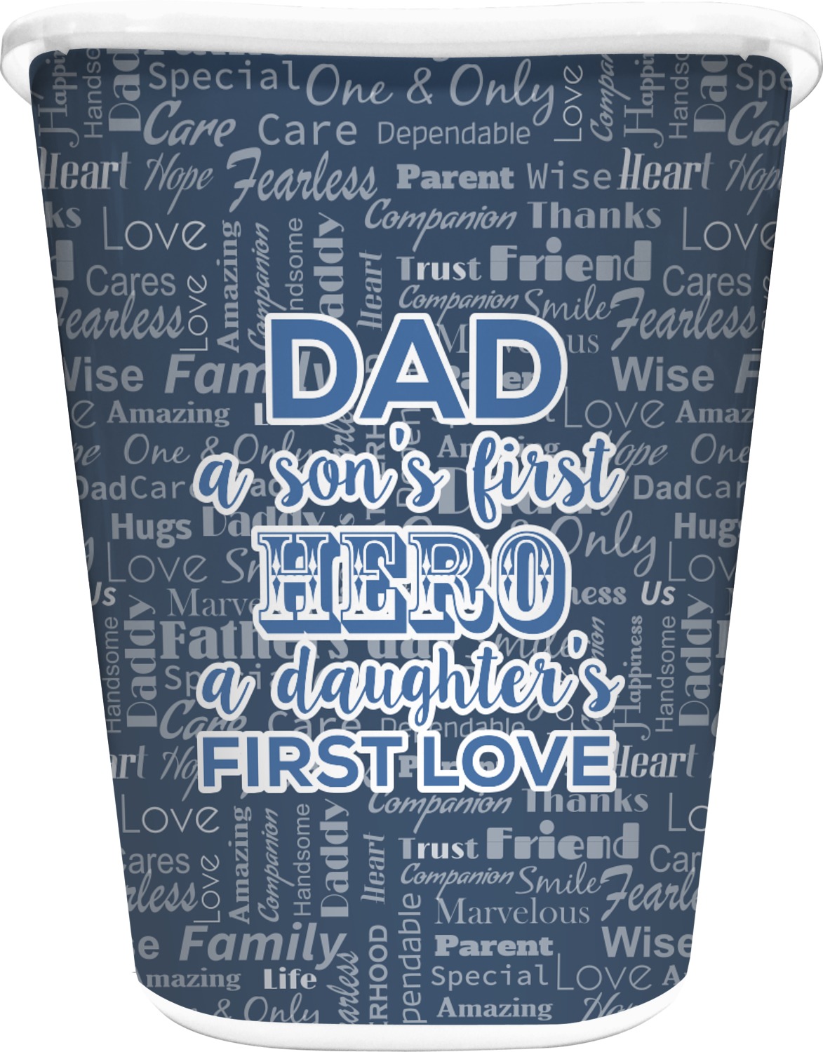The background of this design is a fun word cloud that says different words to describe a father like "friend," "thanks," "father's day," "happiness," and more. The design is filled with a few different shades of blue and a little accent of white. The main graphic is a quote that says "Dad, a son's first hero, a daughter's first love." What a sweet design for Father's Day!