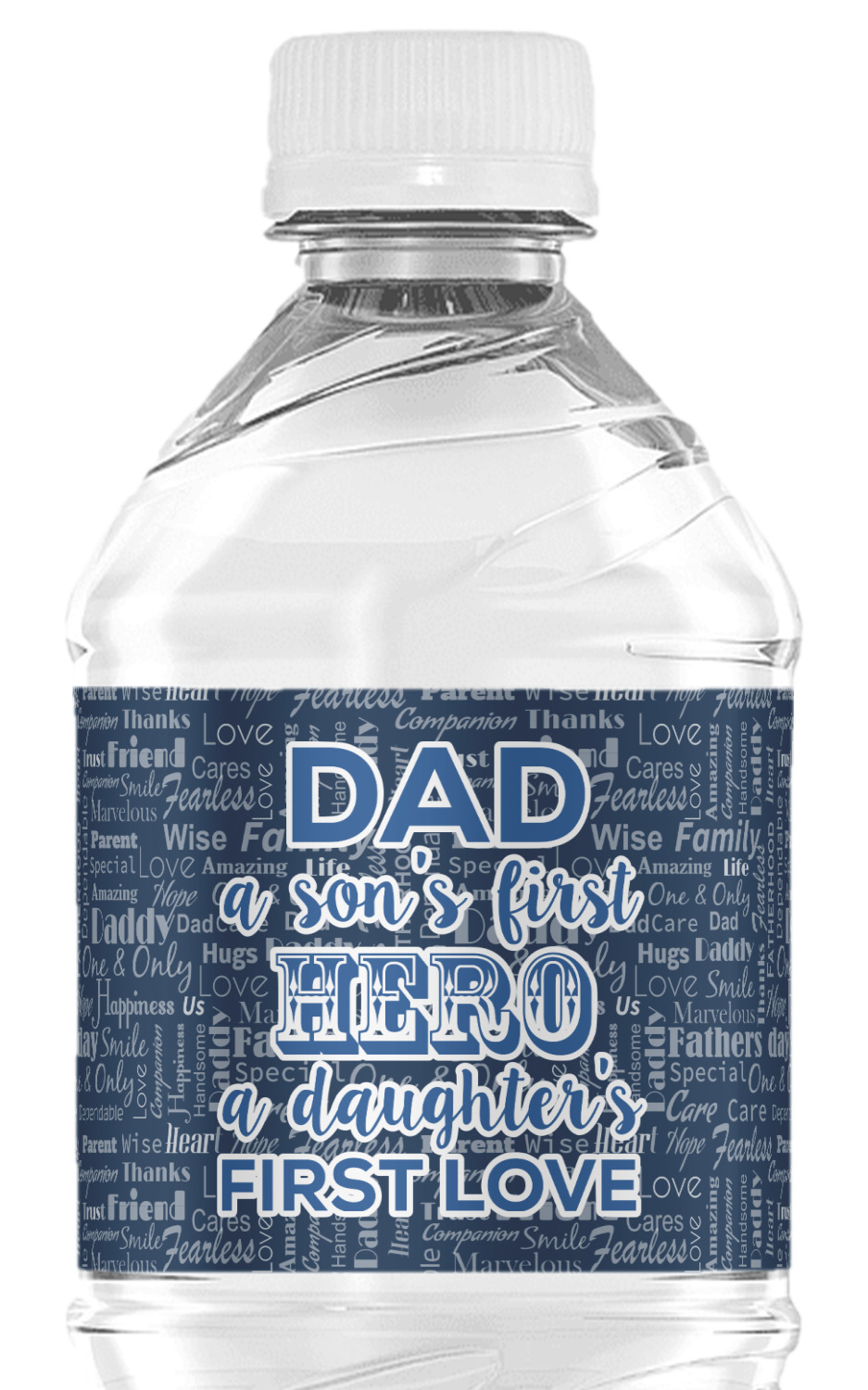 The background of this design is a fun word cloud that says different words to describe a father like "friend," "thanks," "father's day," "happiness," and more. The design is filled with a few different shades of blue and a little accent of white. The main graphic is a quote that says "Dad, a son's first hero, a daughter's first love." What a sweet design for Father's Day!