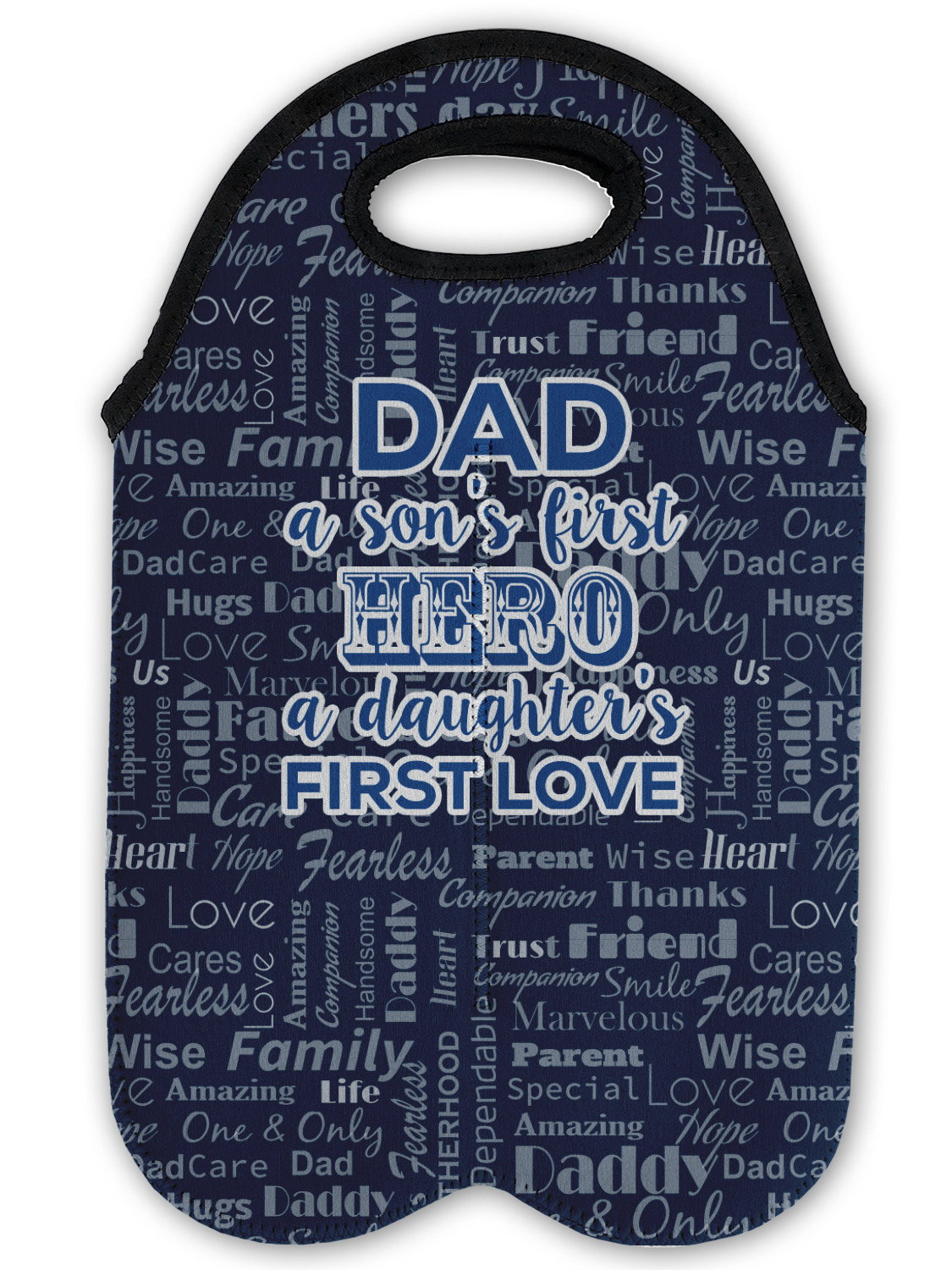 The background of this design is a fun word cloud that says different words to describe a father like "friend," "thanks," "father's day," "happiness," and more. The design is filled with a few different shades of blue and a little accent of white. The main graphic is a quote that says "Dad, a son's first hero, a daughter's first love." What a sweet design for Father's Day!