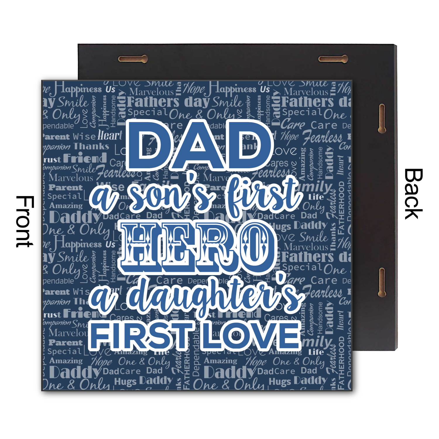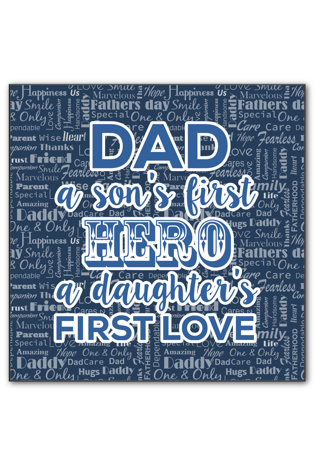 The background of this design is a fun word cloud that says different words to describe a father like "friend," "thanks," "father's day," "happiness," and more. The design is filled with a few different shades of blue and a little accent of white. The main graphic is a quote that says "Dad, a son's first hero, a daughter's first love." What a sweet design for Father's Day!