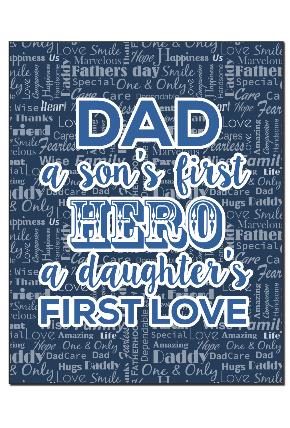 The background of this design is a fun word cloud that says different words to describe a father like "friend," "thanks," "father's day," "happiness," and more. The design is filled with a few different shades of blue and a little accent of white. The main graphic is a quote that says "Dad, a son's first hero, a daughter's first love." What a sweet design for Father's Day!