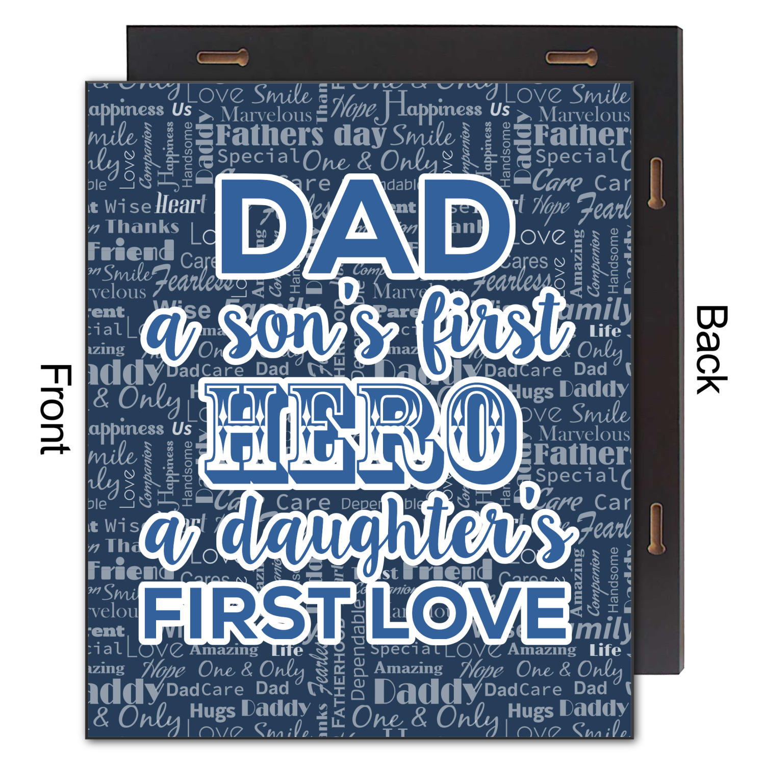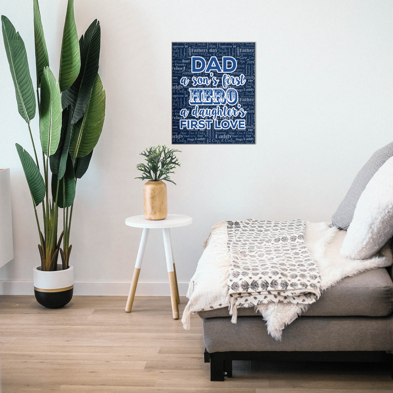 The background of this design is a fun word cloud that says different words to describe a father like "friend," "thanks," "father's day," "happiness," and more. The design is filled with a few different shades of blue and a little accent of white. The main graphic is a quote that says "Dad, a son's first hero, a daughter's first love." What a sweet design for Father's Day!