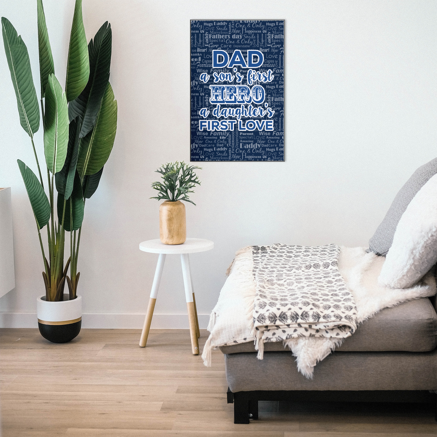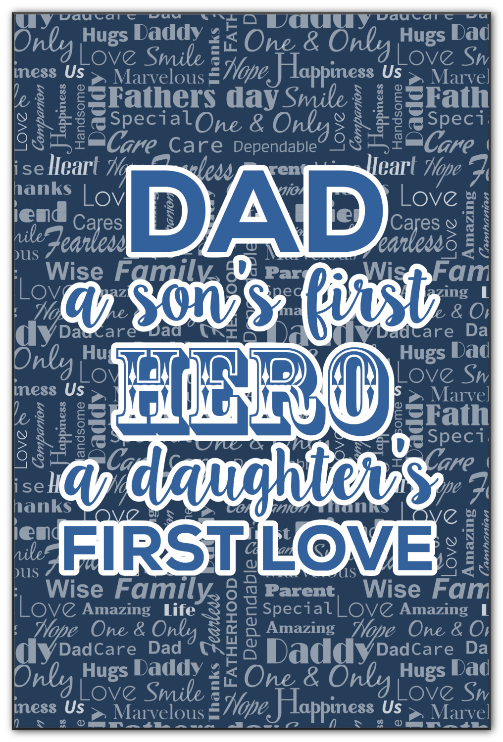 The background of this design is a fun word cloud that says different words to describe a father like "friend," "thanks," "father's day," "happiness," and more. The design is filled with a few different shades of blue and a little accent of white. The main graphic is a quote that says "Dad, a son's first hero, a daughter's first love." What a sweet design for Father's Day!