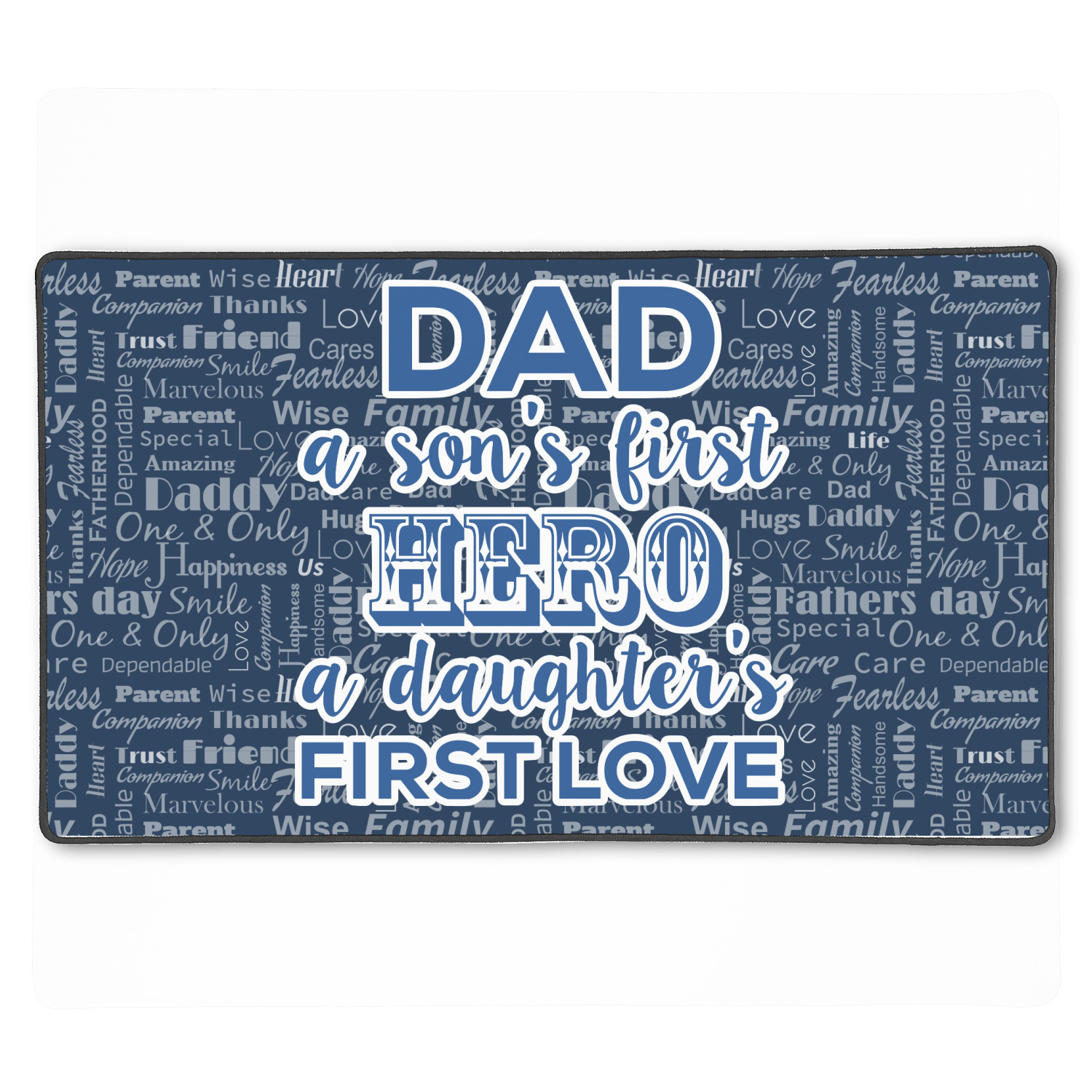 The background of this design is a fun word cloud that says different words to describe a father like "friend," "thanks," "father's day," "happiness," and more. The design is filled with a few different shades of blue and a little accent of white. The main graphic is a quote that says "Dad, a son's first hero, a daughter's first love." What a sweet design for Father's Day!