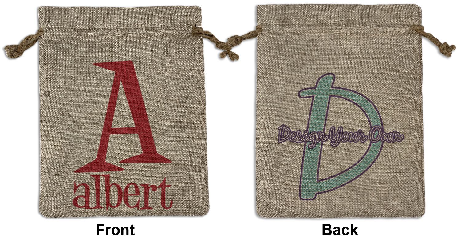 We sell our Burlap Gift Bags in 3 variant sized bags. Made with burlap polyester, each personalized bag can be secured with a twine drawstring pull. Your custom design is available to print on one side or both sides - completely up to you! The sizes of the bags measure approximately 4.5" x 6.5" for the smallest size, 6.5" x 8.0" for the medium size, and 6.5" x 13.5" for the large-sized bag.