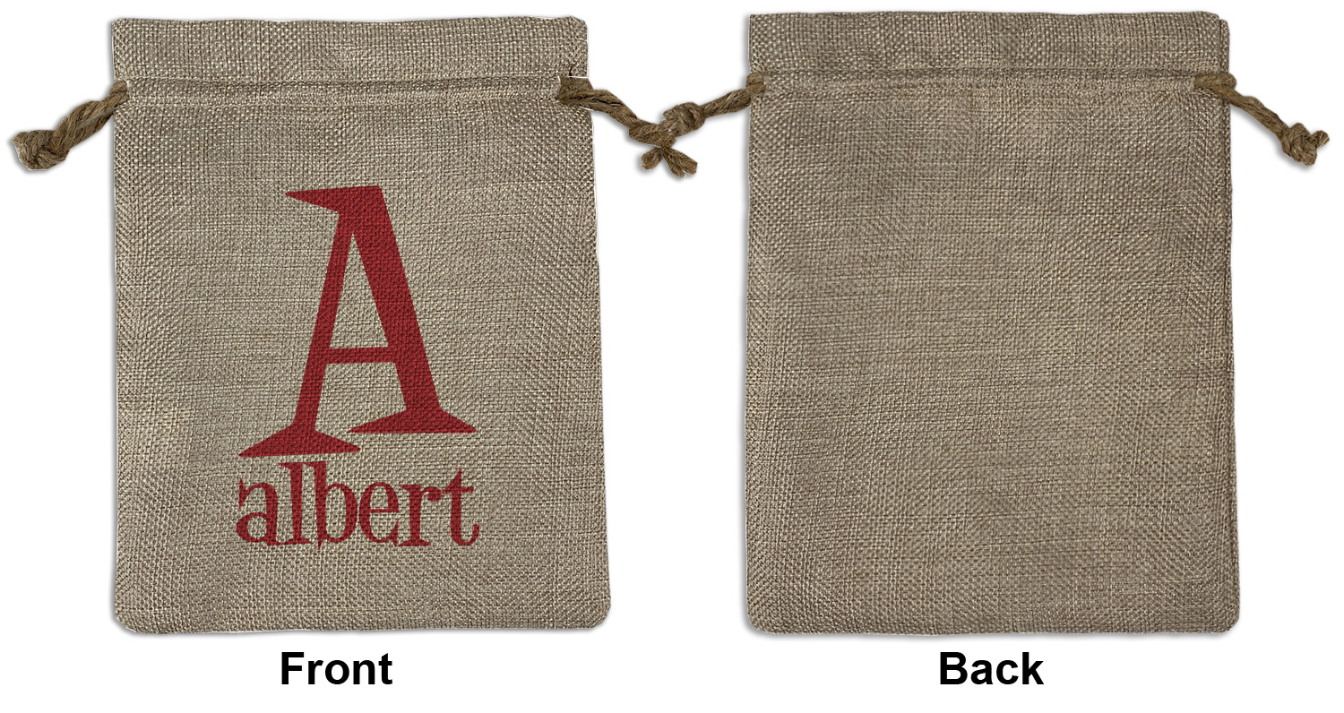 We sell our Burlap Gift Bags in 3 variant sized bags. Made with burlap polyester, each personalized bag can be secured with a twine drawstring pull. Your custom design is available to print on one side or both sides - completely up to you! The sizes of the bags measure approximately 4.5" x 6.5" for the smallest size, 6.5" x 8.0" for the medium size, and 6.5" x 13.5" for the large-sized bag.