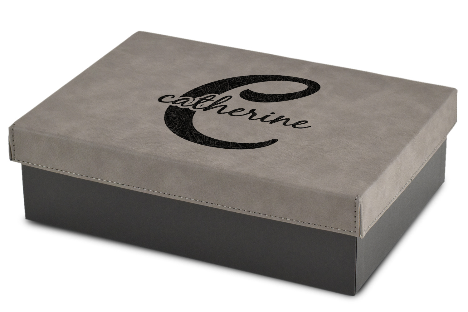 These gift boxes are available in 3 different sizes to accommodate various sized gifts. Available in gray as a neutral color for any occasion as well as to showcase your design boldly. Engraved with a laser this high quality paper board and faux leather gift box is unique and makes any gift stand out.