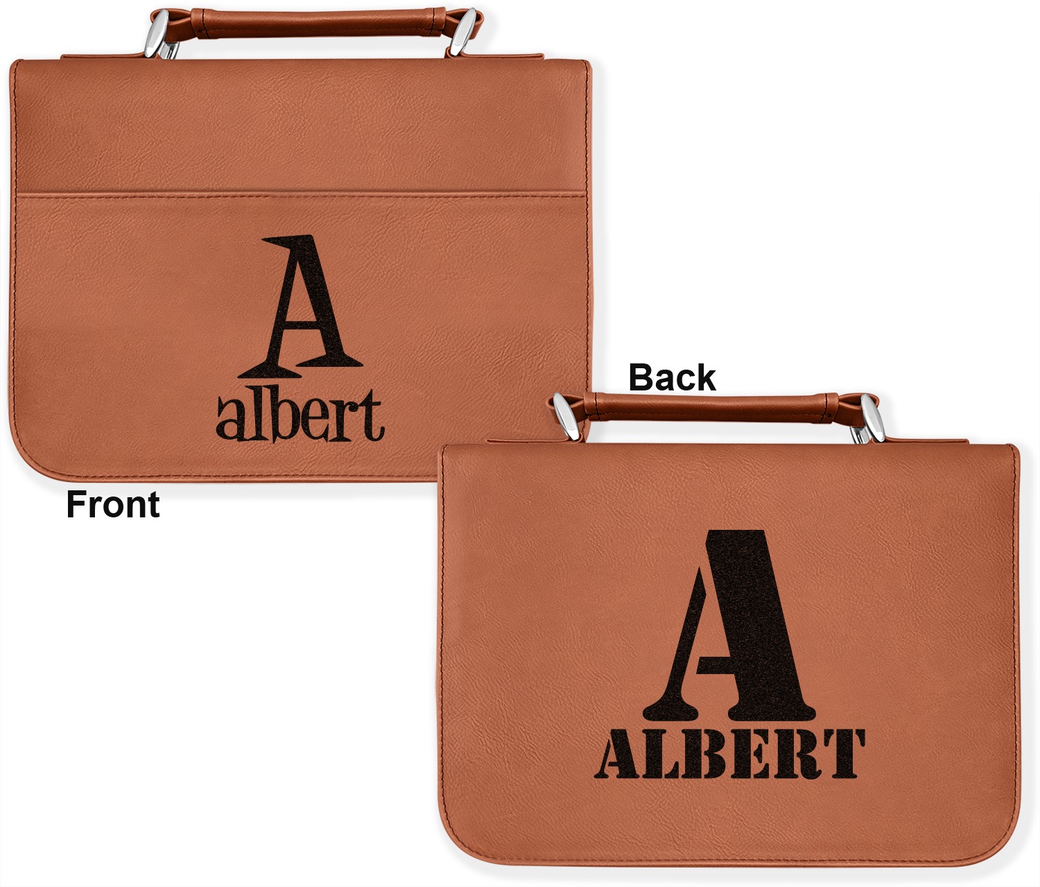 These book covers are fabricated from a fine leatherette in a warm, cognac shade of brown. A wide pocket spans across the front of the book jacket [2,400] and can store any loose papers or notes that you wish to keep. The interior of this personalized Bible cover includes slots on both sides to house the covers of your Bible, and keep it in place. The inside of the spine has a small elastic band to secure a pen. A zipper lines three sides of the cover, while the fourth side features a reinforced handle that allows for easy transport of your enclosed book.