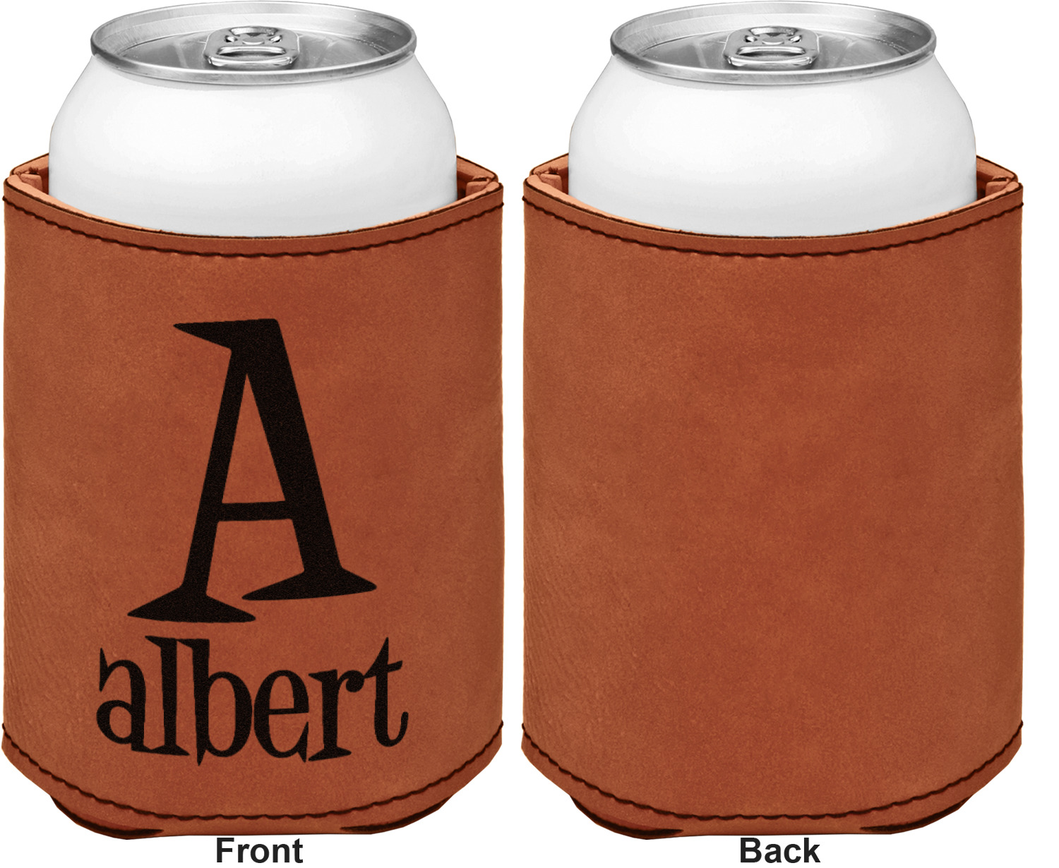 This can sleeve is made from a cognac-brown leatherette and stitched with a sturdy, black thread. A slim padding lines the inside of your can sleeve to allow for a better fit once your drink is inserted. The sleeve itself measures at 4 by 4.5 inches, allowing this custom can sleeve to accommodate most canned drinks. Your personalized design can be engraved on the front and back, or solely the front. When laser-engraved, your design appears as a black coloration which contrasts the leatherette nicely.