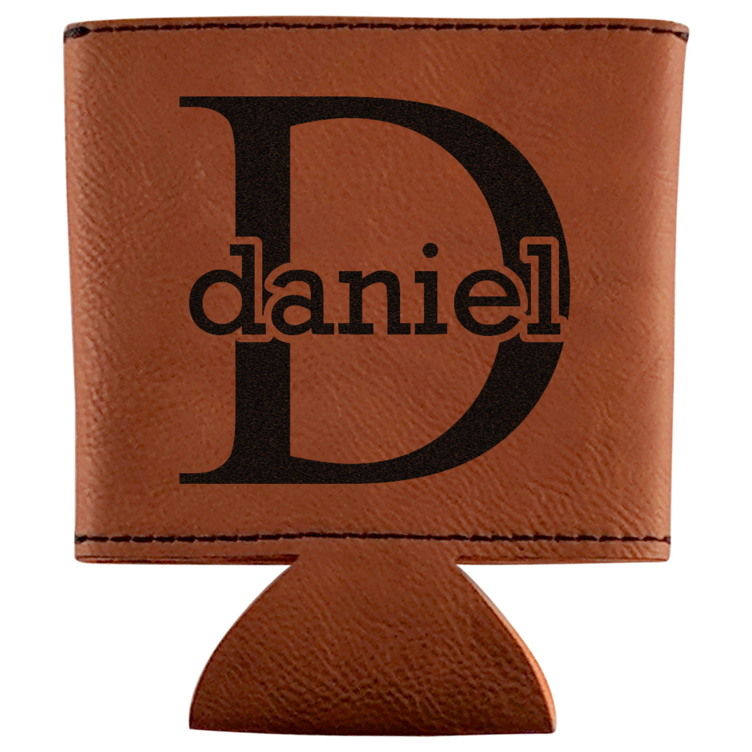 This can sleeve is made from a cognac-brown leatherette and stitched with a sturdy, black thread. A slim padding lines the inside of your can sleeve to allow for a better fit once your drink is inserted. The sleeve itself measures at 4 by 4.5 inches, allowing this custom can sleeve to accommodate most canned drinks. Your personalized design can be engraved on the front and back, or solely the front. When laser-engraved, your design appears as a black coloration which contrasts the leatherette nicely.
