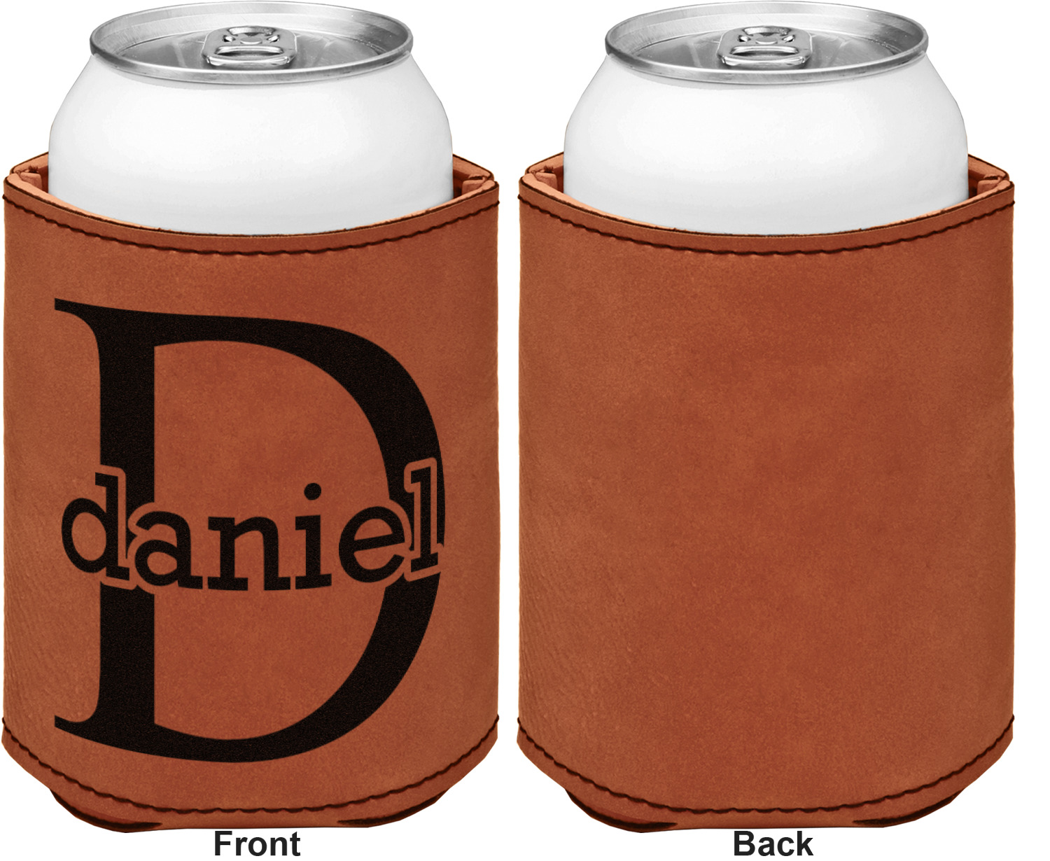 This can sleeve is made from a cognac-brown leatherette and stitched with a sturdy, black thread. A slim padding lines the inside of your can sleeve to allow for a better fit once your drink is inserted. The sleeve itself measures at 4 by 4.5 inches, allowing this custom can sleeve to accommodate most canned drinks. Your personalized design can be engraved on the front and back, or solely the front. When laser-engraved, your design appears as a black coloration which contrasts the leatherette nicely.