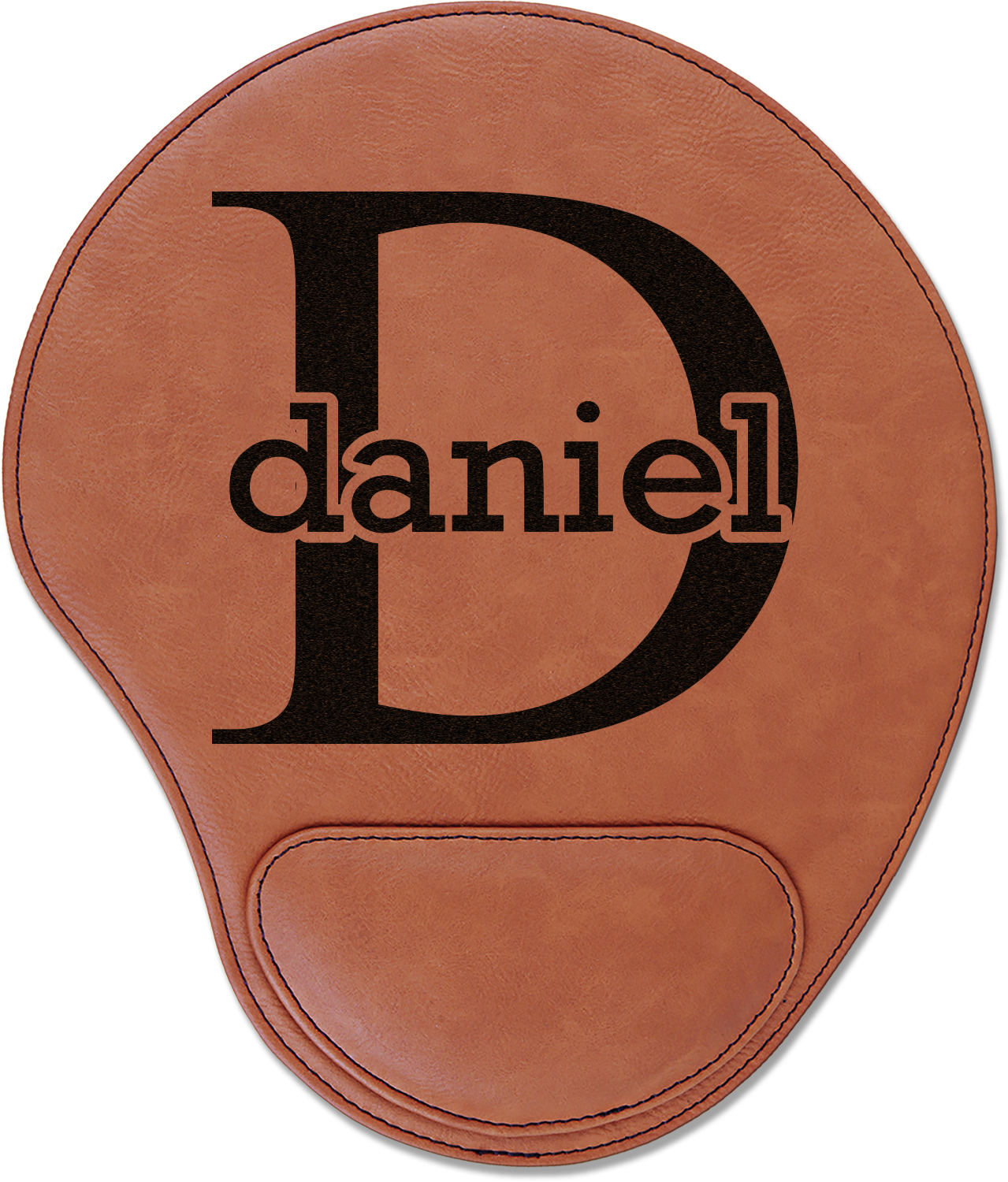 In a rounded shape, this mouse pad is made of a luxurious, cognac-colored leatherette. The nature of this material allows your mouse to glide smoothly across its surface. Strong stitching lines the edges to guarantee stability and strength. As added support for tired wrists, your personalized mouse pad features a supportive wrist rest at its bottom. This model measures at 10.25" x 9", while its wrist pad is approximately 5" x 2.75", with a thickness of 0.75". Your personalized design is laser engraved into the front face of this mouse pad.