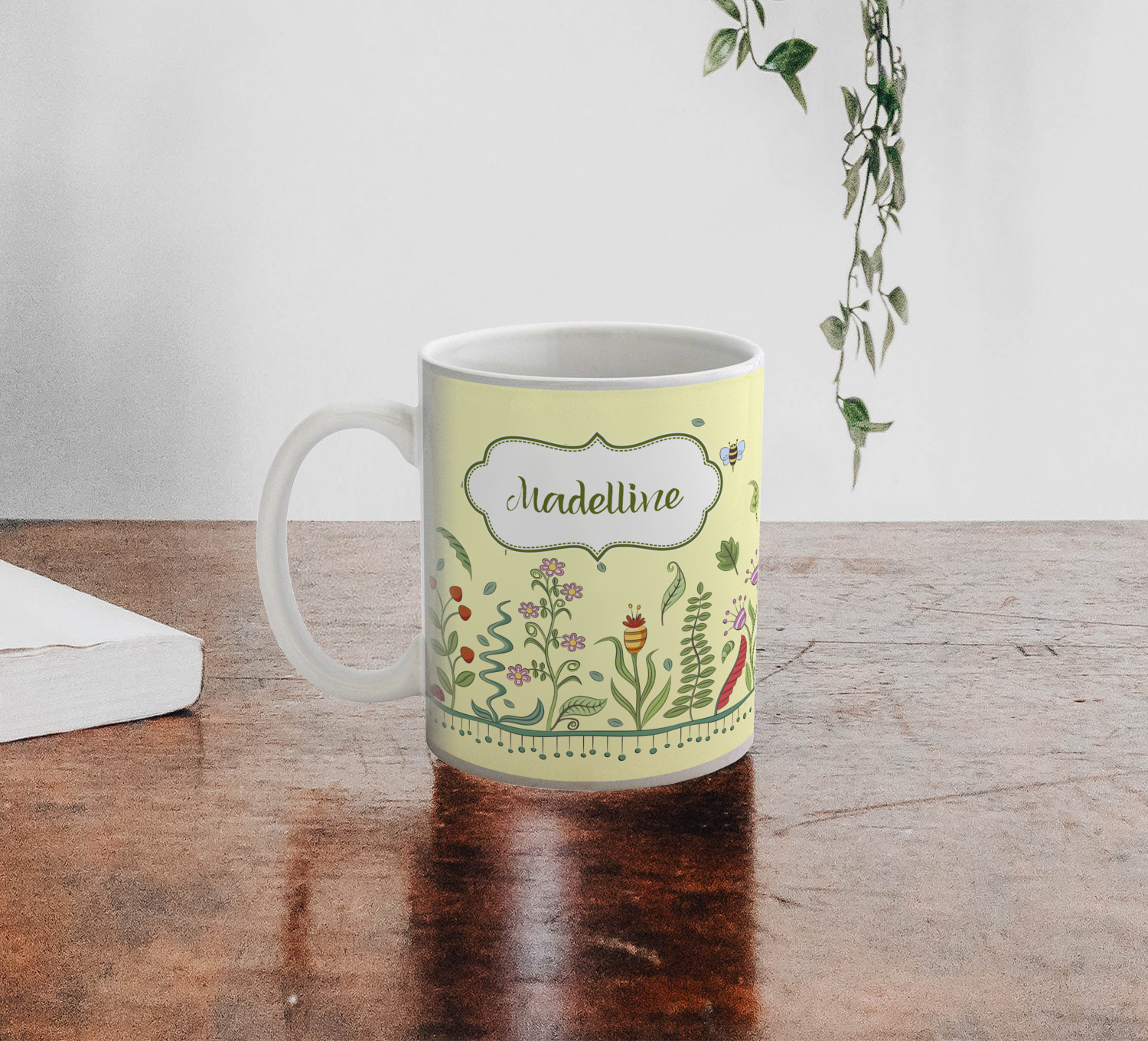 This beautiful, yet simple and elegant nature inspired design consists of growing flowers, leaves and the insects that are found around flowers such as ladybugs, bees, butterflies and snails. We have featured the design with a light yellow background, however, you can change it to any color you want. Changing the background color to a navy blue or black changes the look from sweet to elegant! Your personalization goes in a rectangular label across the top. The coordinating pattern and elements are all related to flowers and insects as well.