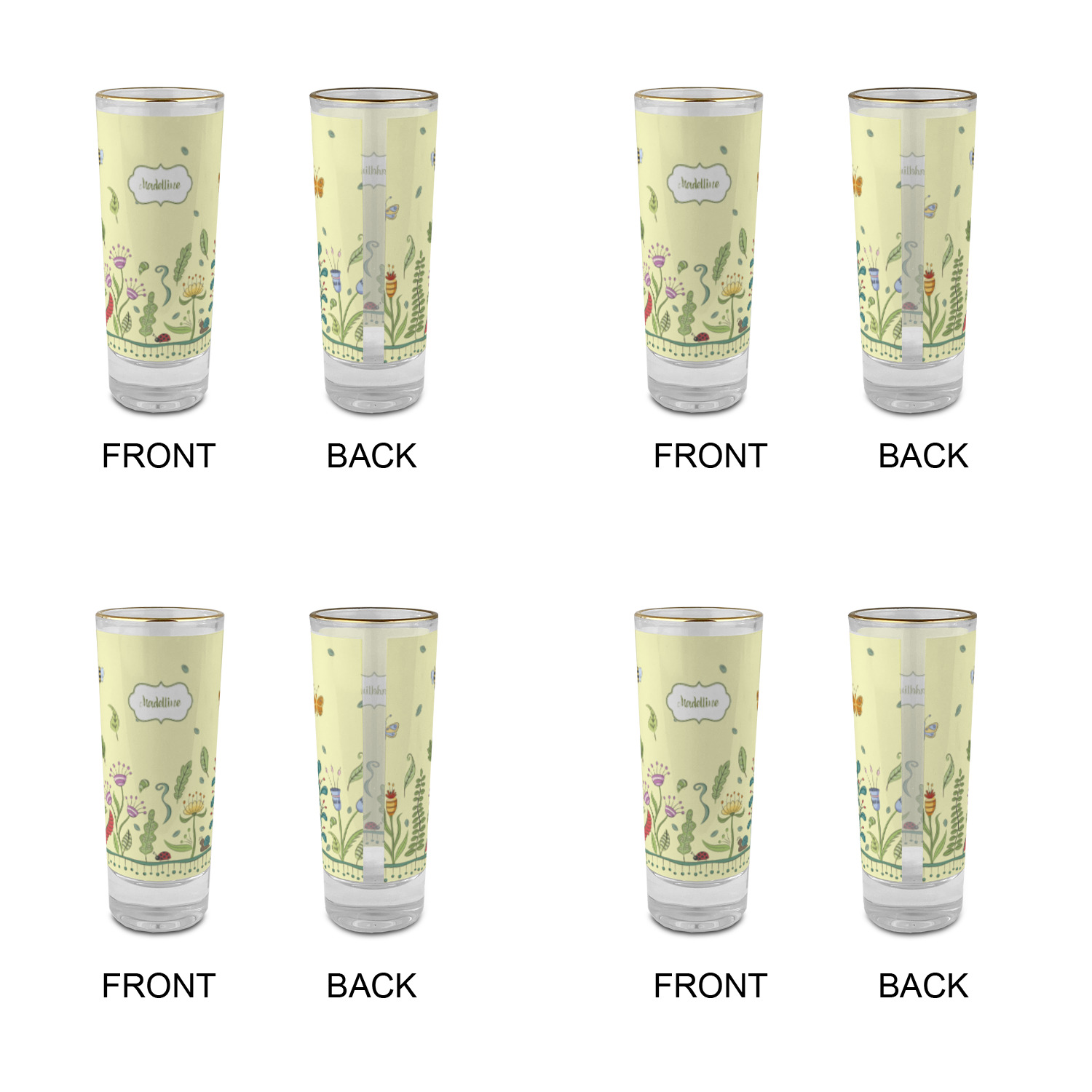 These glass shooter glasses are printed in full color with the design of your choice. These are a tall shooter 2 oz size and stand 4" tall. The print is a full wrap design to boldly display your personalization.