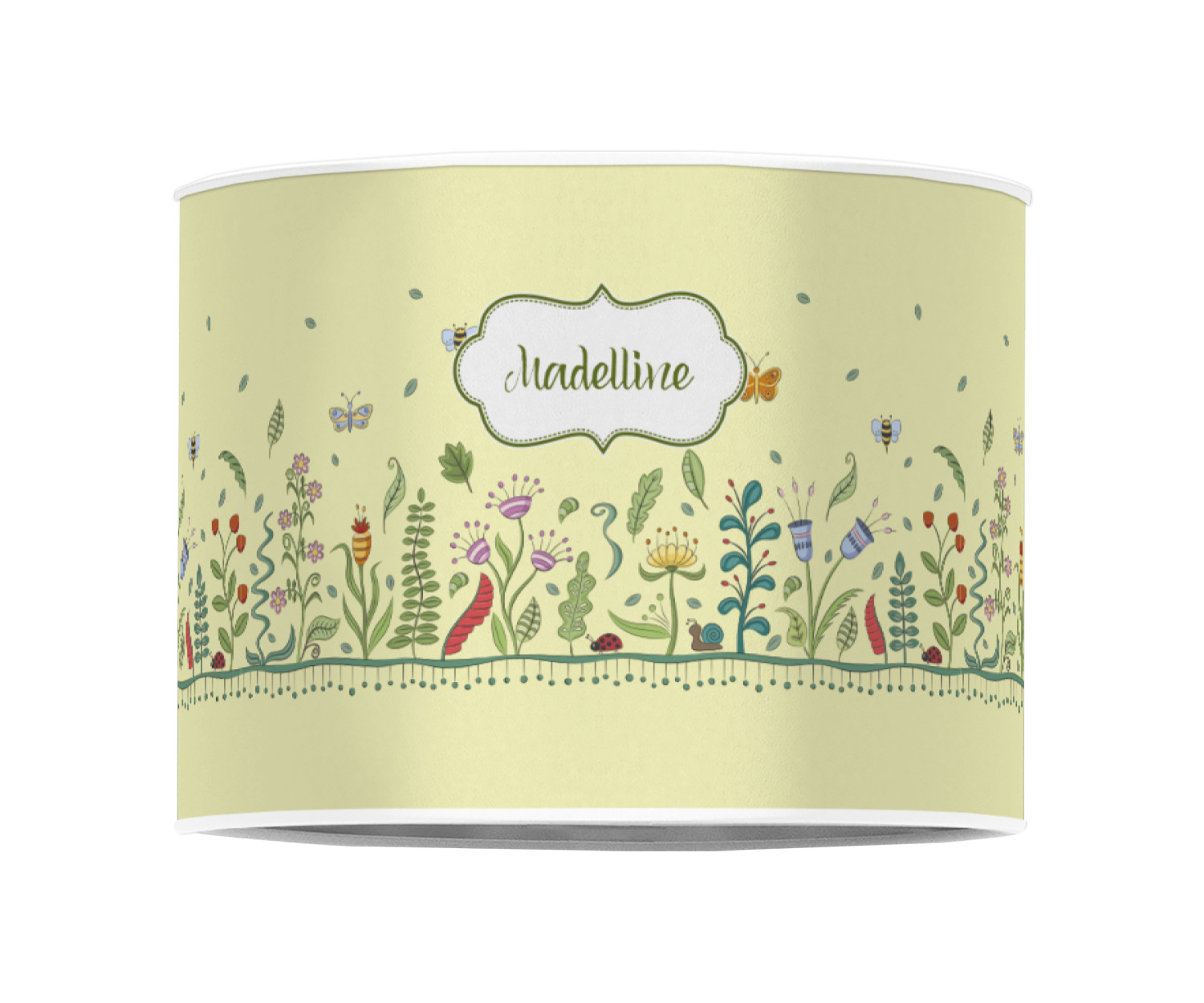 This beautiful, yet simple and elegant nature inspired design consists of growing flowers, leaves and the insects that are found around flowers such as ladybugs, bees, butterflies and snails. We have featured the design with a light yellow background, however, you can change it to any color you want. Changing the background color to a navy blue or black changes the look from sweet to elegant! Your personalization goes in a rectangular label across the top. The coordinating pattern and elements are all related to flowers and insects as well.