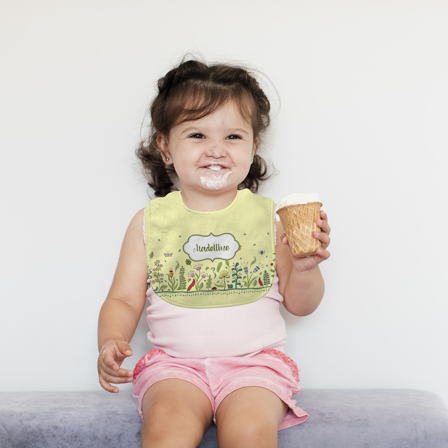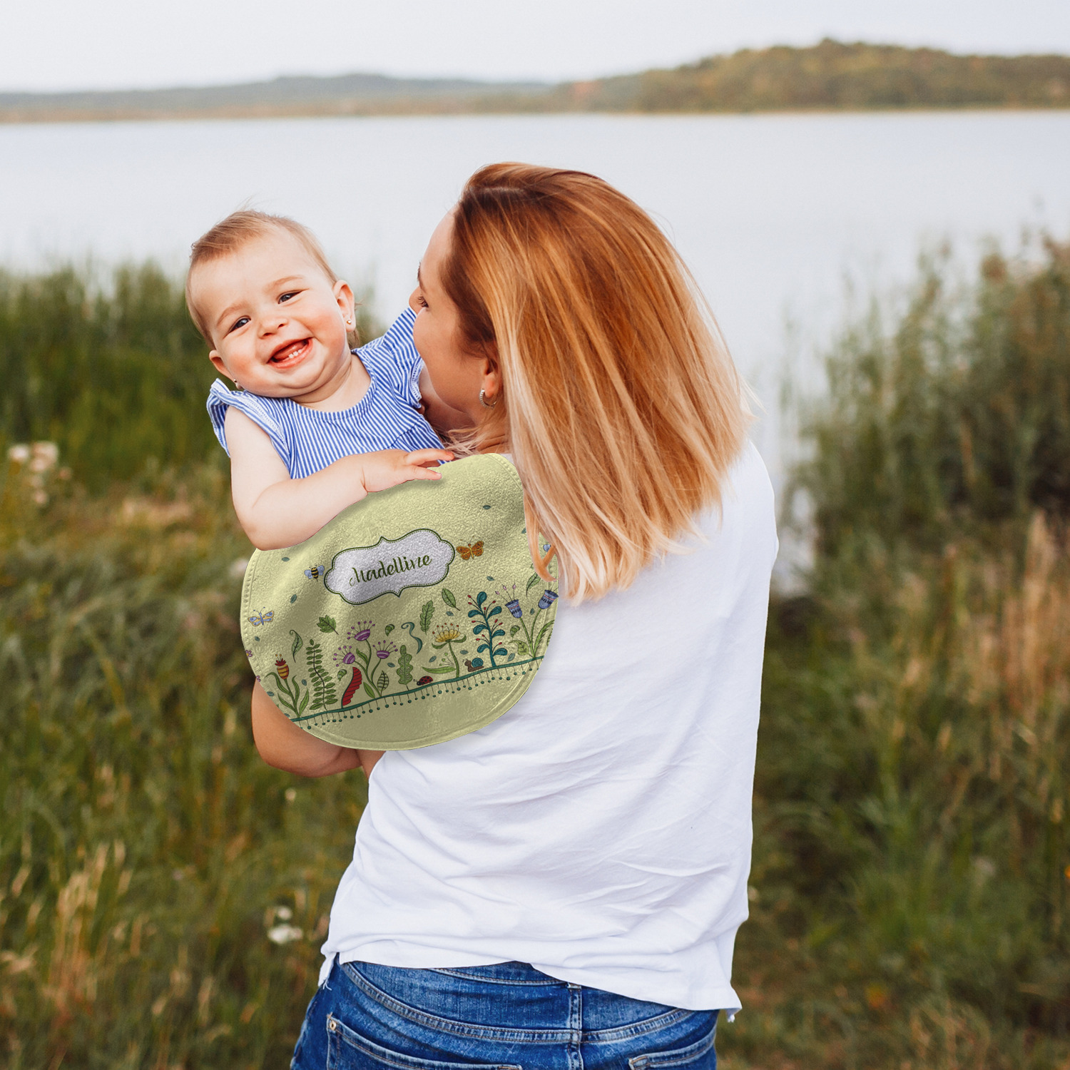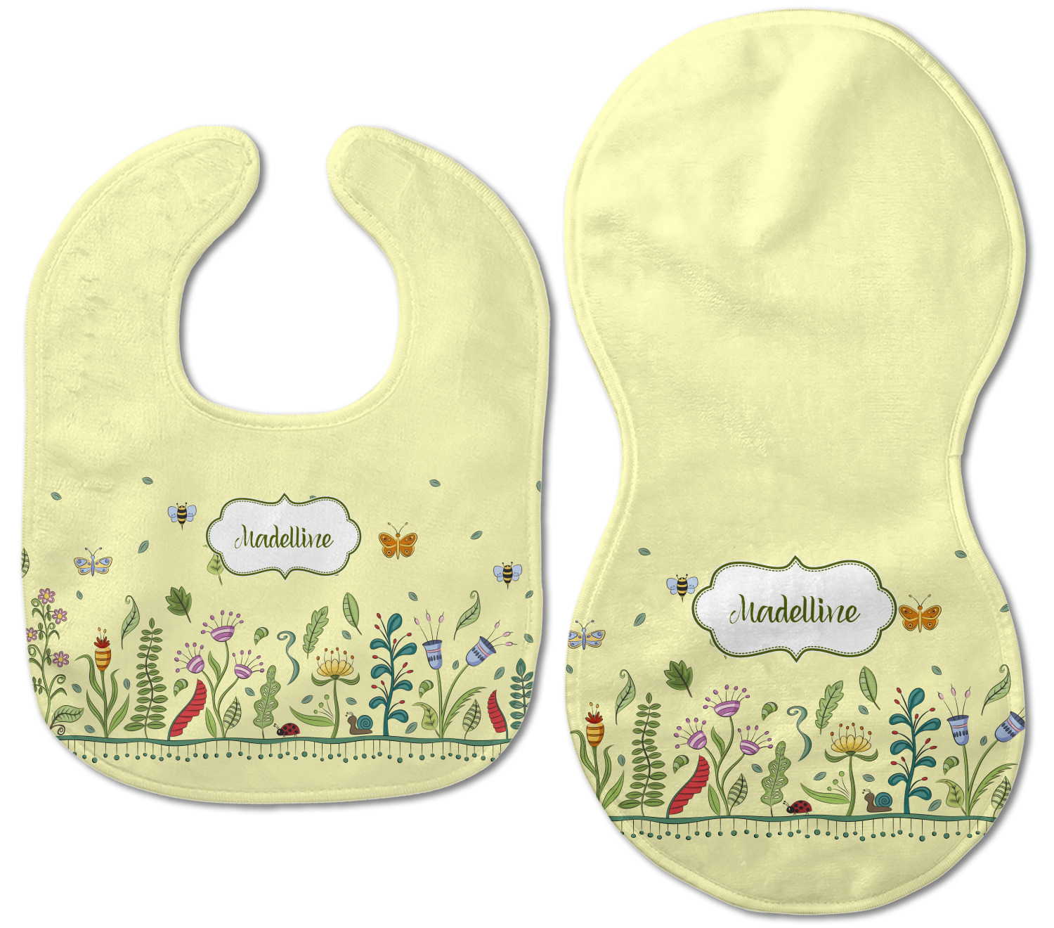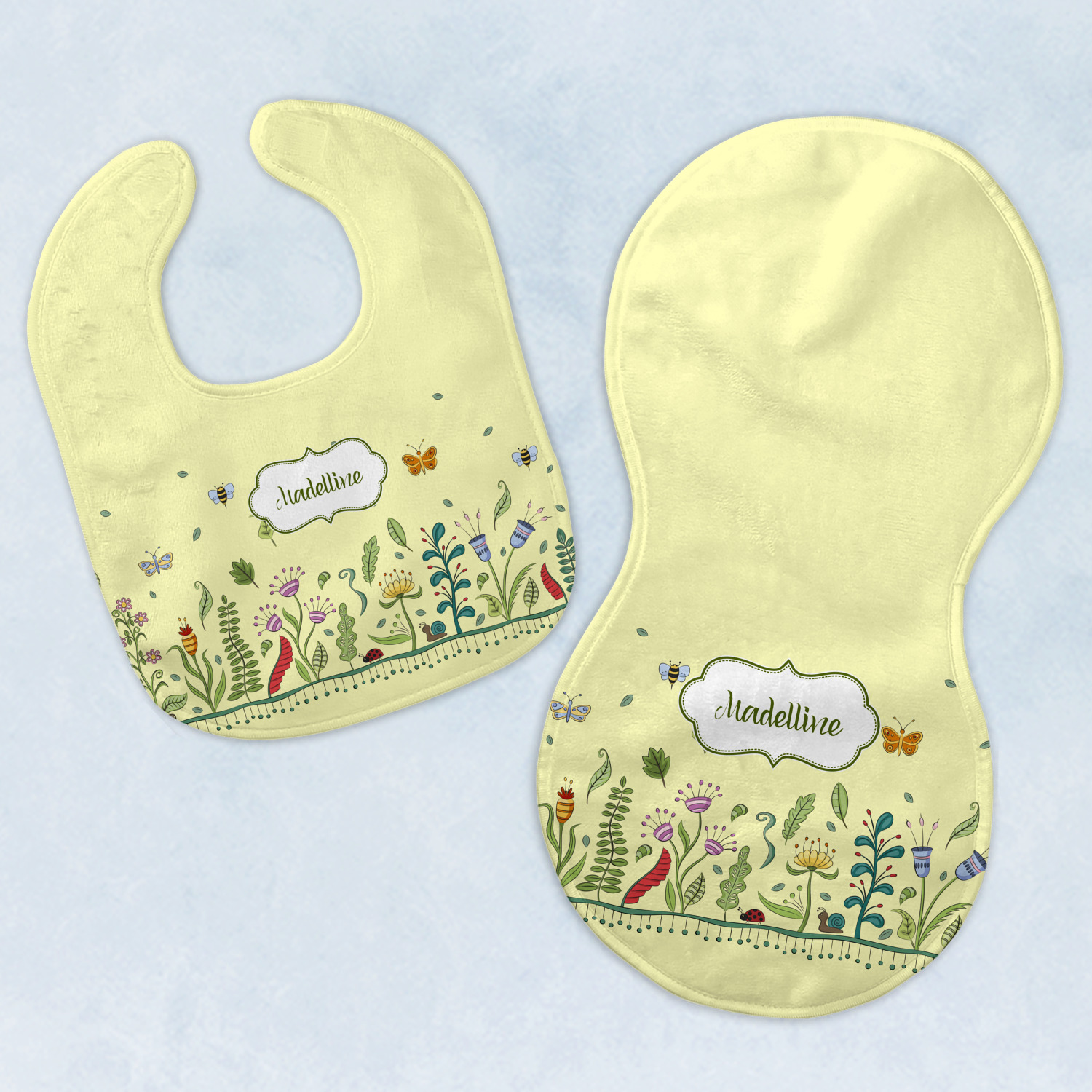 Both our baby bib and burp pad are made up of soft, microfiber velour with a cotton backing. The comfortable and plush material of our bib and burp set is perfect for both baby and parent. We print your design on the microfiber velour face fabric with baby safe ink on your customizable bib and burp cloth to ensure safety for the little one! Our drool bib also comes with a Velcro clasp for safe and easy wear while the burp cloth is a unique peanut shape that perfectly hugs over the shoulder.